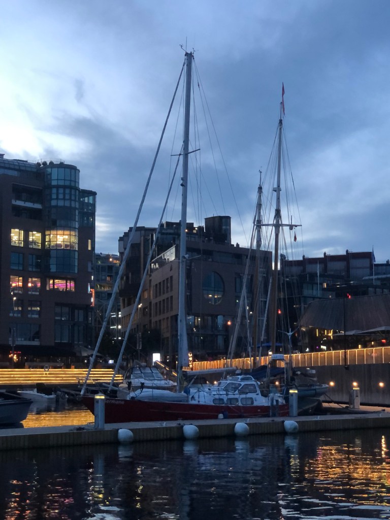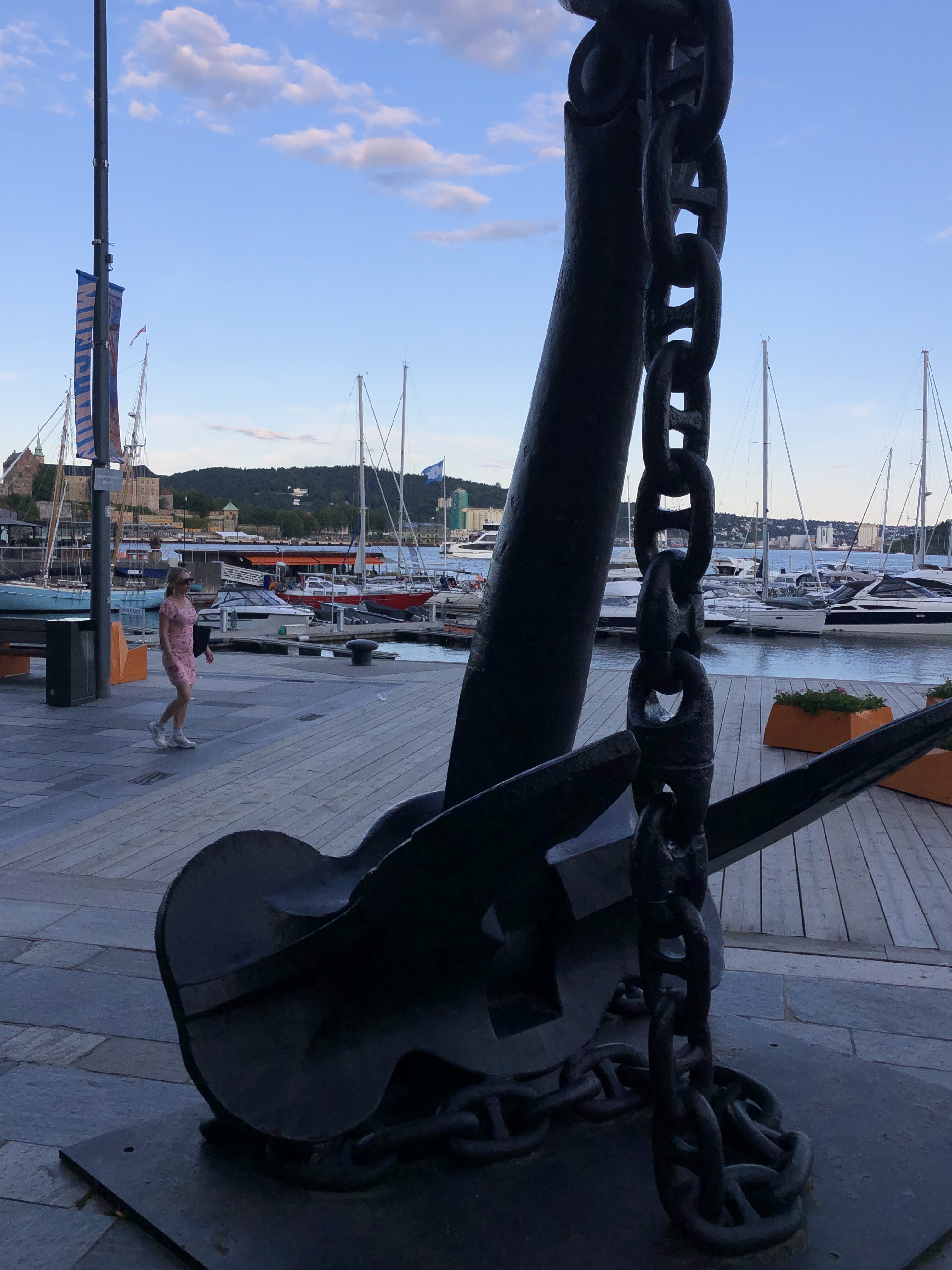 Kaum zu glauben aber der Sommer hat nach Norwegen zurück gefunden und wir begeben uns auf einen langen Schlag von 70 Seemeilen nach OSLO. Da der Wind gegen Mittag einschlafen soll machen wir uns schon um 5 Uhr auf den Weg. Eine gute Entscheidung wie sich heraus stellte, denn wir wurden mit optimalen Segelbedingungen belohnt. Germane schien ebenfalls Freude an diesen Bedingungen zu haben und machte selbst bei abnehmendem Wind noch fünf Knoten Fahrt. Wie vorhergesagt schlief der Wind gegen Mittag ein und Onkel Günter musste den Antrieb auf den verbleibenden 40 Meilen übernehmen. So dieselten wir bei feinstem Sonnenschein den Oslo Fjord entlang und genossen das Privileg hier unterwegs sein zu können. Dass es nicht selbstverständlich ist in Frieden und Freiheit und zu leben wird wieder einmal deutlich, als wir uns der DRØBAG Enge nähern. Schon von weitem können wir die Geschützstellungen auf der Insel OSCARSBØRG erkennen. Diese Insel ist ein natürliches Hindernis mitten im Fjord und verengt ihn auf eine Breite von nur 200m. Am 09.April 1940 wurde von dort aus der deutsche Kreuzer BLÜCHER unter Feuer genommen und versenkt. 830 Besatzungsmitglieder kamen dabei ums Leben. Das Wrack liegt noch heute in 90 Metern Tiefe welches wir in unmittelbarer Nähe passieren. Gegen 18 Uhr machen wir in der AKKA BRYGGE Marina mitten im Zentrum von OSLO fest. In 200m Entfernung steht gut sichtbar eine riesiger Anker auf der Promenade. In Hafenstädten sicherlich keine Seltenheit, dass alte ausgediente Anker ausgestellt sind und damit maritimes Flair verbreiten. Diesen weist jedoch eine kleine Plakette als den Anker der BLÜCHER aus, was ihn (für diejenigen die sich damit beschäftigen) eher als ein Statement im Kontrast zum bunten Treiben in den Restaurants und Kneipen seiner Umgebung erscheinen lässt.
