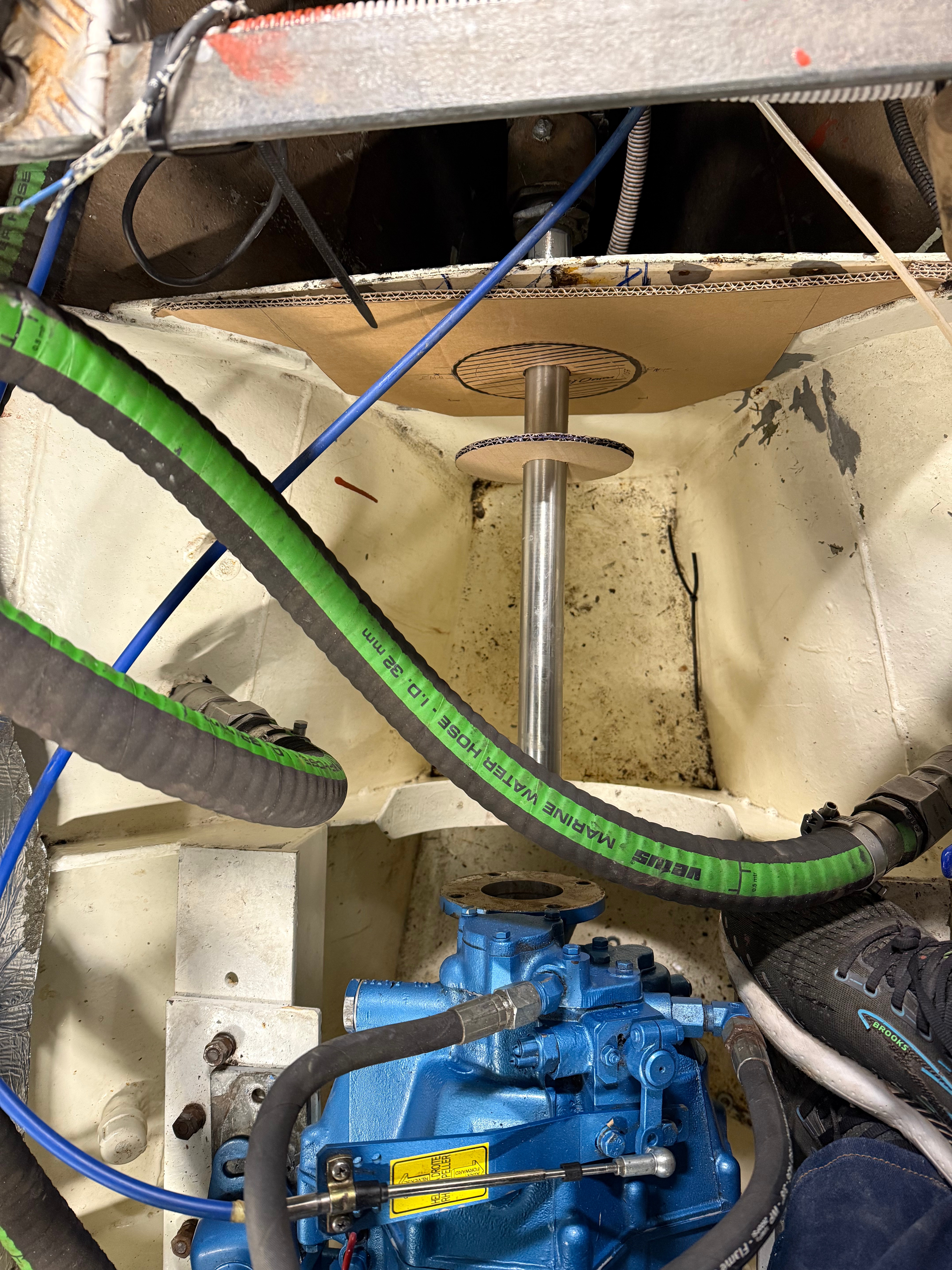 Jetzt geht es mit den technischen Arbeiten weiter. Aufgrund der starren Verbindung zwischen Motor und Wellenanlage werden Vibrationen in den Schiffsrumpf übertragen. Obwohl der Motor richtig ausgerichtet ist, sich eine flexible Kupplung zwischen Getriebe und Welle befindet, stören uns die Vibrationen. Abhilfe soll durch den Einbau eines Drucklagers und einer Gelenkwelle, eines sogenannten Phyton Drive, geschaffen werden. Die letzten Tage haben wir alles vermessen und Zeichnungen für Adapterplatten angefertigt. Im Januar wird es dann spannend, wenn Theorie auf Praxis trifft. Eigentlich sollte es vom Platz her passen. Ob es wirklich so ist wird sich im neuen Jahr zeigen. Es bleibt also spannend. Jetzt ist erstmal Weihnachtspause, im neuen Jahr gehts weiter.