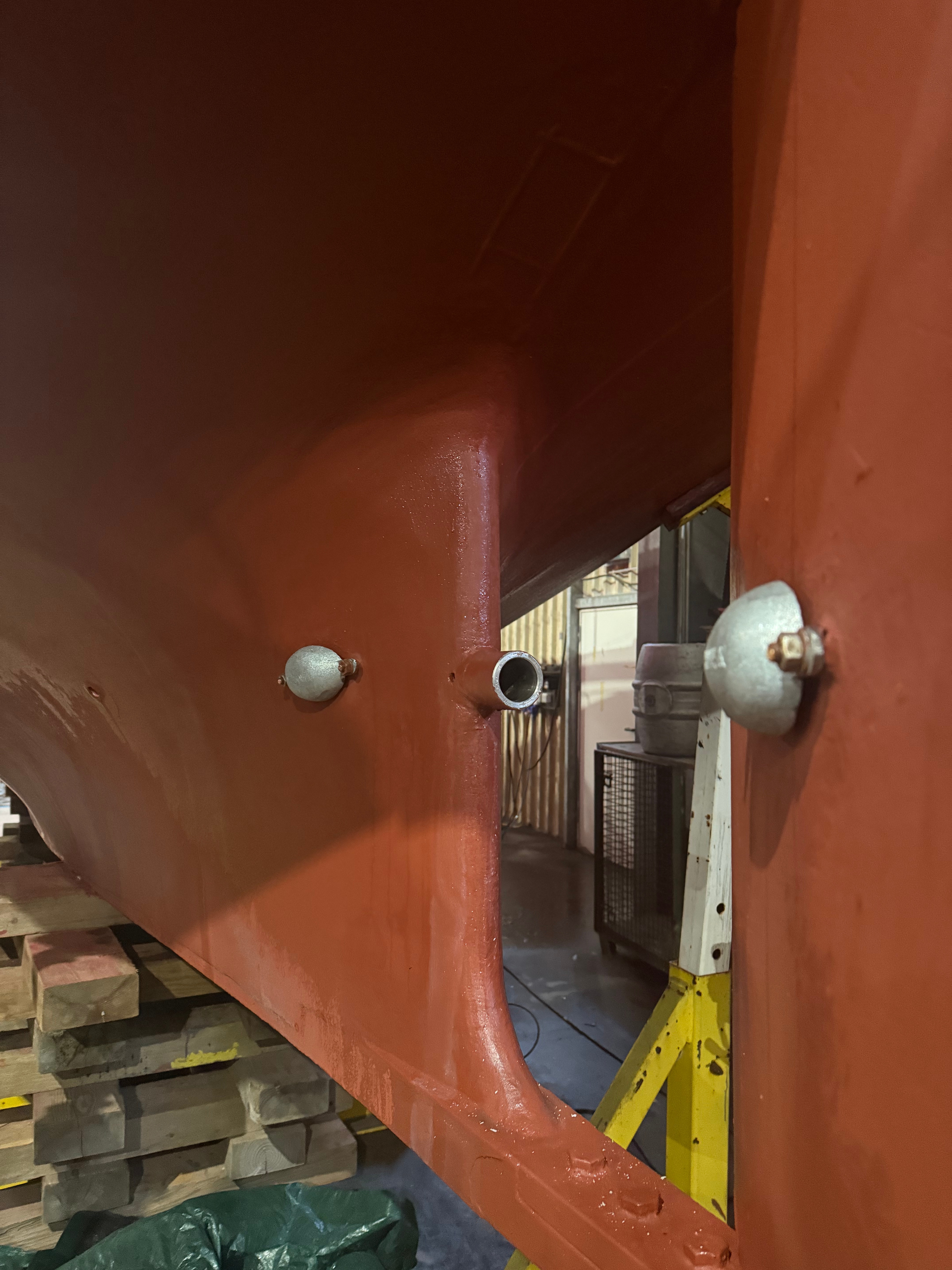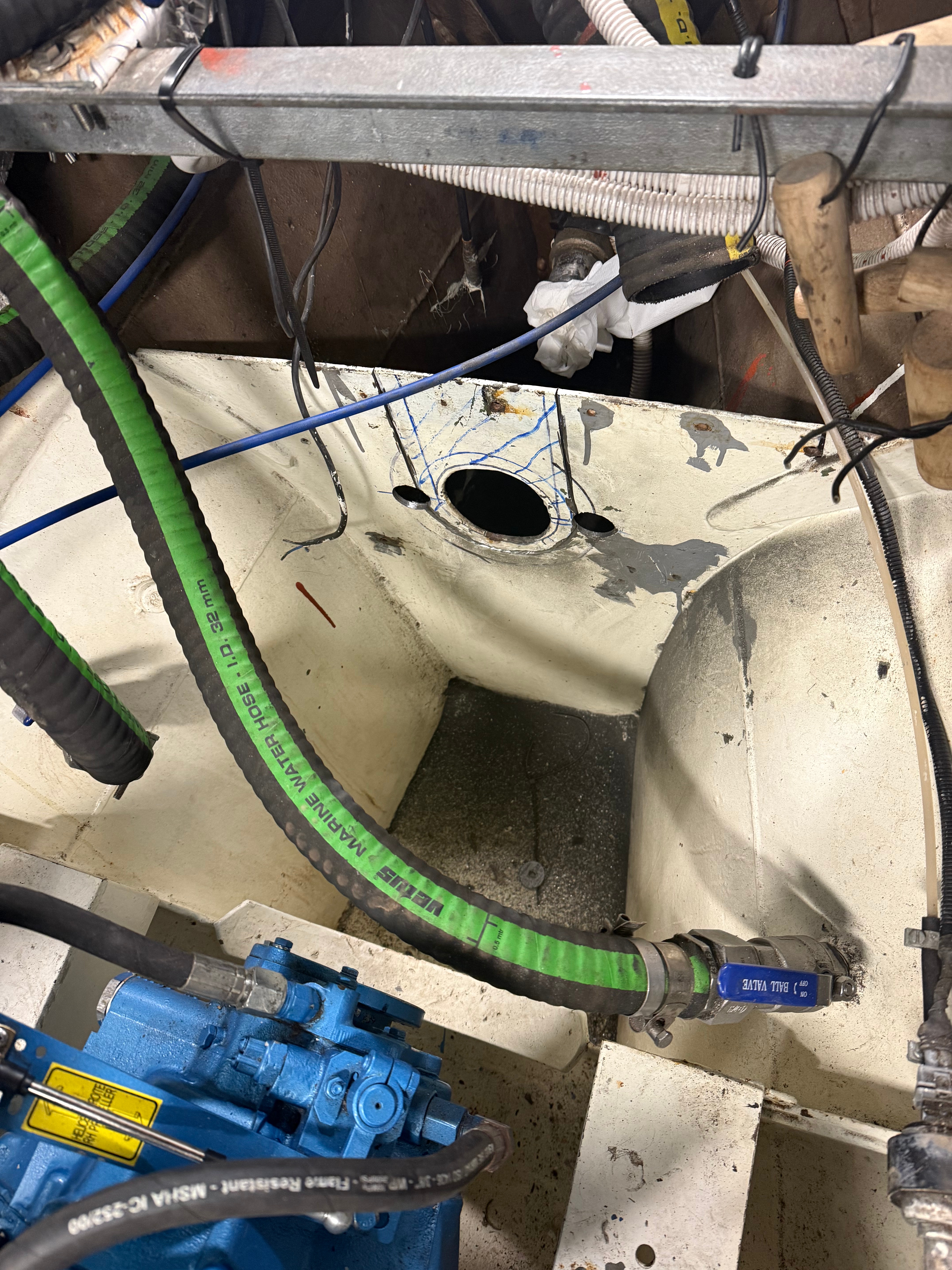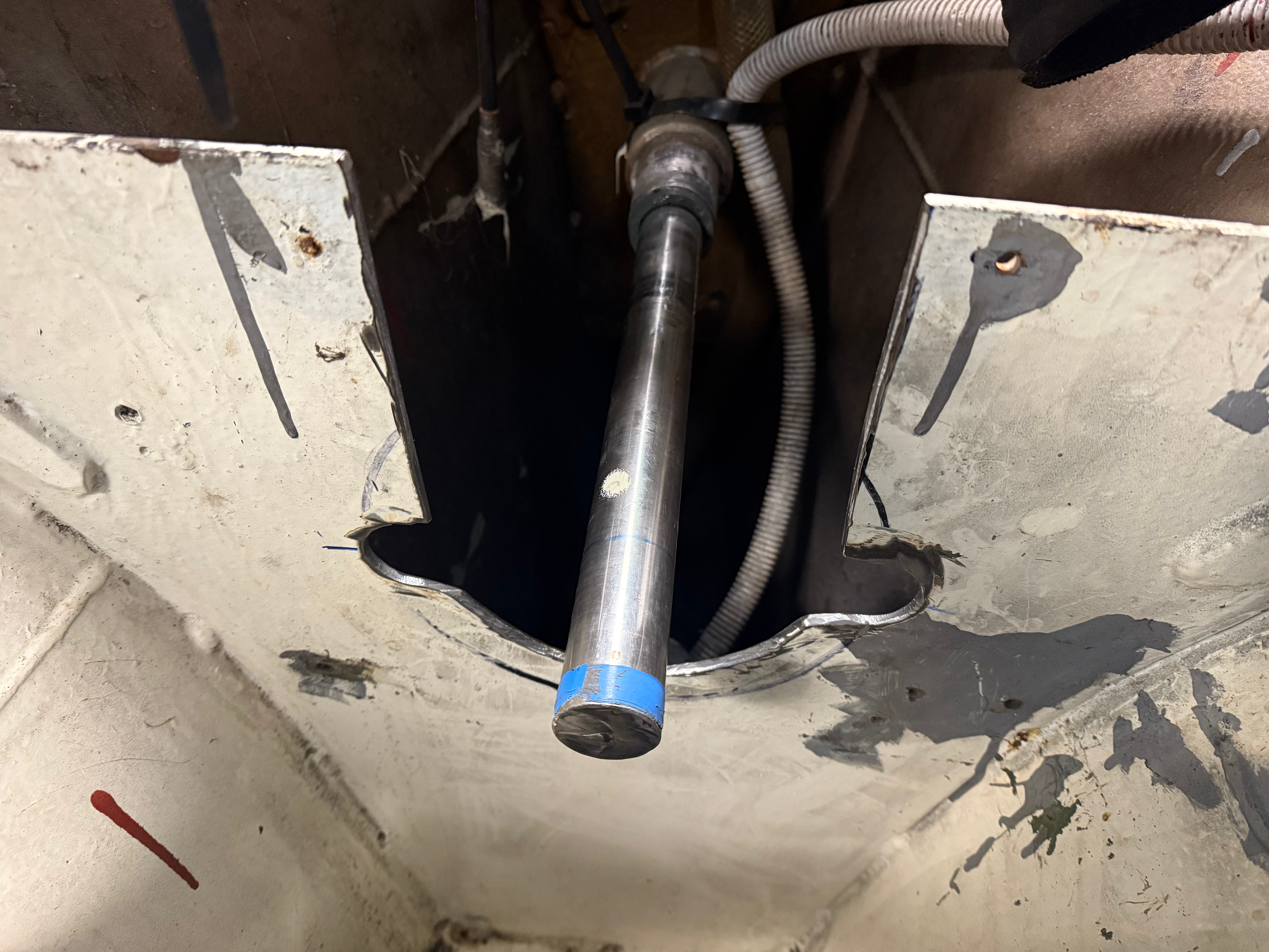 Ein großer Vorteil von Germane ist der variable Tiefgang. Der Schwert lässt sich hydraulisch in den Rumpf einschwenken, dadurch können wir den Tiefgang von 2,3m auf 1,3m verringern. Mit ausgeklapptem Schwert segelt Germane recht hoch am Wind, mit eingeklappten Schwert können wir uns in Ecken fummeln, die anderen Segelyachten verwehrt bleiben. Der Nachteil an dieser Sache ist allerdings, dass sich ein Kasten unterhalb der Wasserlinie befindet und von außen nicht kontrolliert werden kann. Gammelt dieser durch, saufen wir ab! Nach 41 Jahren war es somit an der Zeit, sich diesem Schwertkasten einmal anzunehmen. Wie zuvor schon beschrieben ist er solide gebaut und hätte auch noch 40 weitere Jahre gehalten. Mit dem neuen Wissen, dass alles in Ordnung ist, können wir jetzt wieder beruhigt in abgelegenere Gebiete segeln. Ein wenig Rost wurde entfernt, die Stellen neu versiegelt und der Kasten von innen mit neuem Antifouling versehen. Nach unten wurde eine neue Dichtlippe eingesetzt, die bei Fahrt Verwirbelungen in den nach unten offenen Kasten verhindern soll. Die gesamte Schwenkhydraulik wurde bei dieser Gelegenheit ebenfalls überprüft und gewartet. Alles wieder Chick 🙂