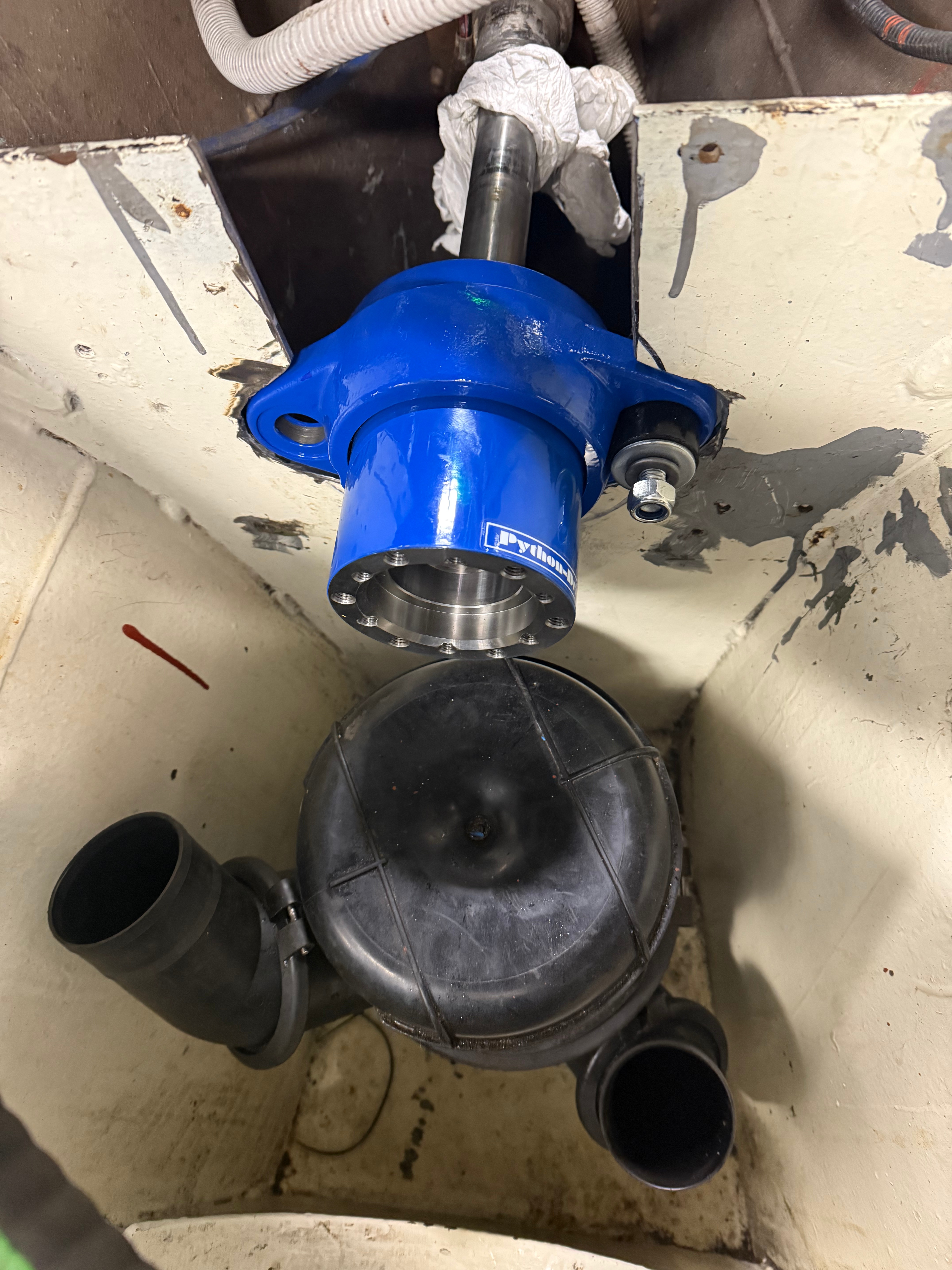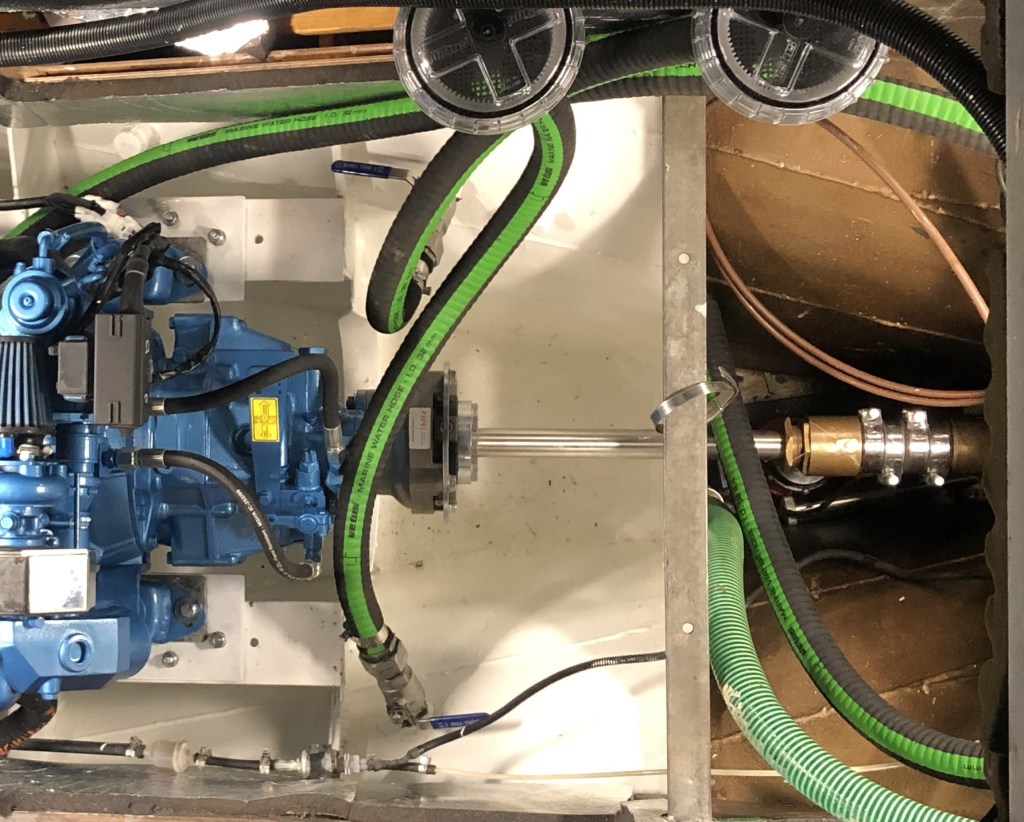 Abhilfe soll nun ein Python Drive schaffen. Dabei wird die Welle im Stevenrohr motorseitig durch ein Drucklager zentriert. Der Propellerschub wir dann über das Drucklager in den Rumpf eingeleitet und nicht mehr über Motor – Motorfüße – Motorfundamente. Die Kraftübertragung zwischen Motor und Wellenanlage erfolgt über eine Gelenkwelle, ähnlich wie beim Auto zwischen Getriebe – Achse – Rad. Das auch dieser Umbau wieder mit einer Menge Planung, Zeit und Geld einhergeht, muss nicht im Detail beschrieben werden. Jetzt hoffen wir, dass diese Investition auch zum gewünschten Ergebnis führt. Eine Verbesserung wird es auf jeden Fall sein. Nun warten wir auf die in Auftrag gegebenen Teile (Adapterplatte Drucklager, Adapterplatten Motorfüße), um den Einbau abzuschließen. Wir werden berichten.