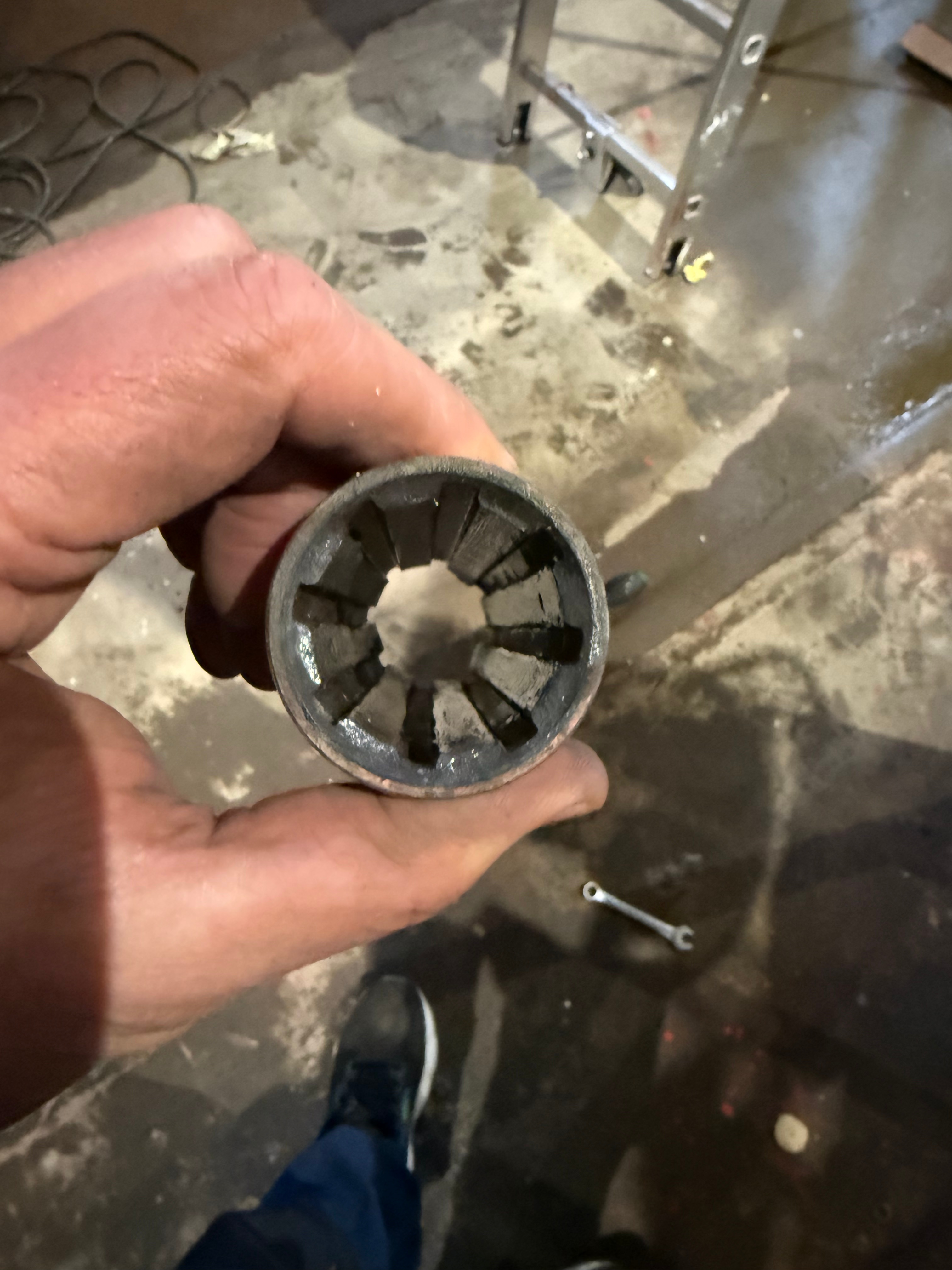 Der Januar ist fast rum und wir warten auf die letzten Teile zum Einbau der neuen Wellenanlage. Wie zuvor bereits geschrieben, hatten wir bei Motorfahrt stets Vibrationen im Schiff. Der Motor ist auf Gummiblöcken gelagert, damit dessen Schwingungen aufgenommen werden können. Die Leistung des Motors wird über eine Wellenanlage zum Propeller übertragen, der wiederum den Schub erzeugt. Dieser Schub wird dann über Wellenanlage, Motorblock, Gummifüße und Motorfundamente zurück in den Rumpf übertragen. Der Teil der Welle der im Stevenrohr (Rohr zur Rumpfdurchführung) läuft, wird an beiden Enden durch Notlauflager geführt. Diese Lager haben ein Spiel von je einem Millimeter. Am hinteren Ende wird die Welle durch das „nasse Wellenlager“ zentriert, am motorseitigen Wellenausgang hingegen durch den Motor. Allein durch die Schwingungen des laufenden Motors kommt es zu Schlägen im Notlauflager am motorseitigen Stevenrohr-Ausgang. Durch den Propellerschub wird der Motor zusätzlich in seinen gummigelagerten Motorfüßen bewegt, dadurch ist die Zentrierung der Welle im Stevenrohr erst recht nicht mehr gegeben. Diese Umstände lassen darauf schließen, dass die Vibrationen im Schiffsrumpf hauptsächlich über das motorseitige Notlauflager im Stevenrohr übertragen werden. Deutliche Laufspuren an der Welle unterstützen diese Annahme.