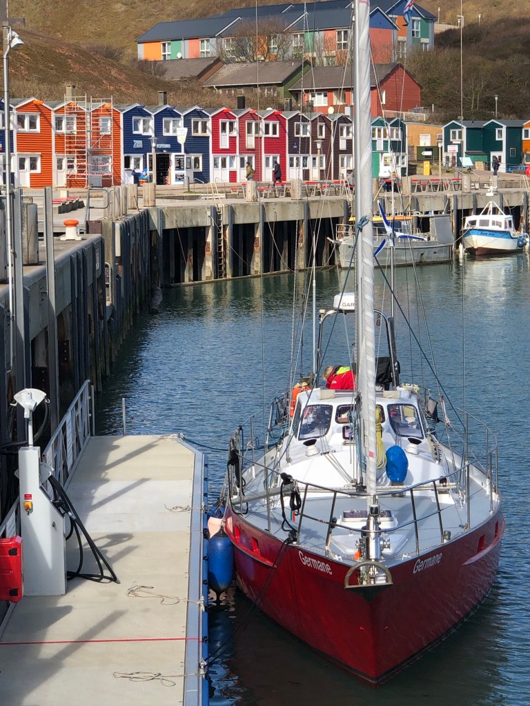 02.04.2022 Cuxhaven – 13.04.2022 Helgoland. Um 0500Uhr sind wir mit der ersten Brückenöffnung aus der City Marina Cuxhaven in Richtung Helgoland ausgelaufen. Bei frischen 5-6 Bft aus Nordost ging es bei mitlaufender Strömung zügig voran. Fünf Stunden später haben wir im Helgoländer Südhafen festgemacht. Hier werden wir das schlechte Wetter der nächsten Tage abwettern und auf passende Bedingungen warten, um weiter nach Norden zu segeln. Für uns war es wichtig loszukommen, der Rest wird sich ergeben.