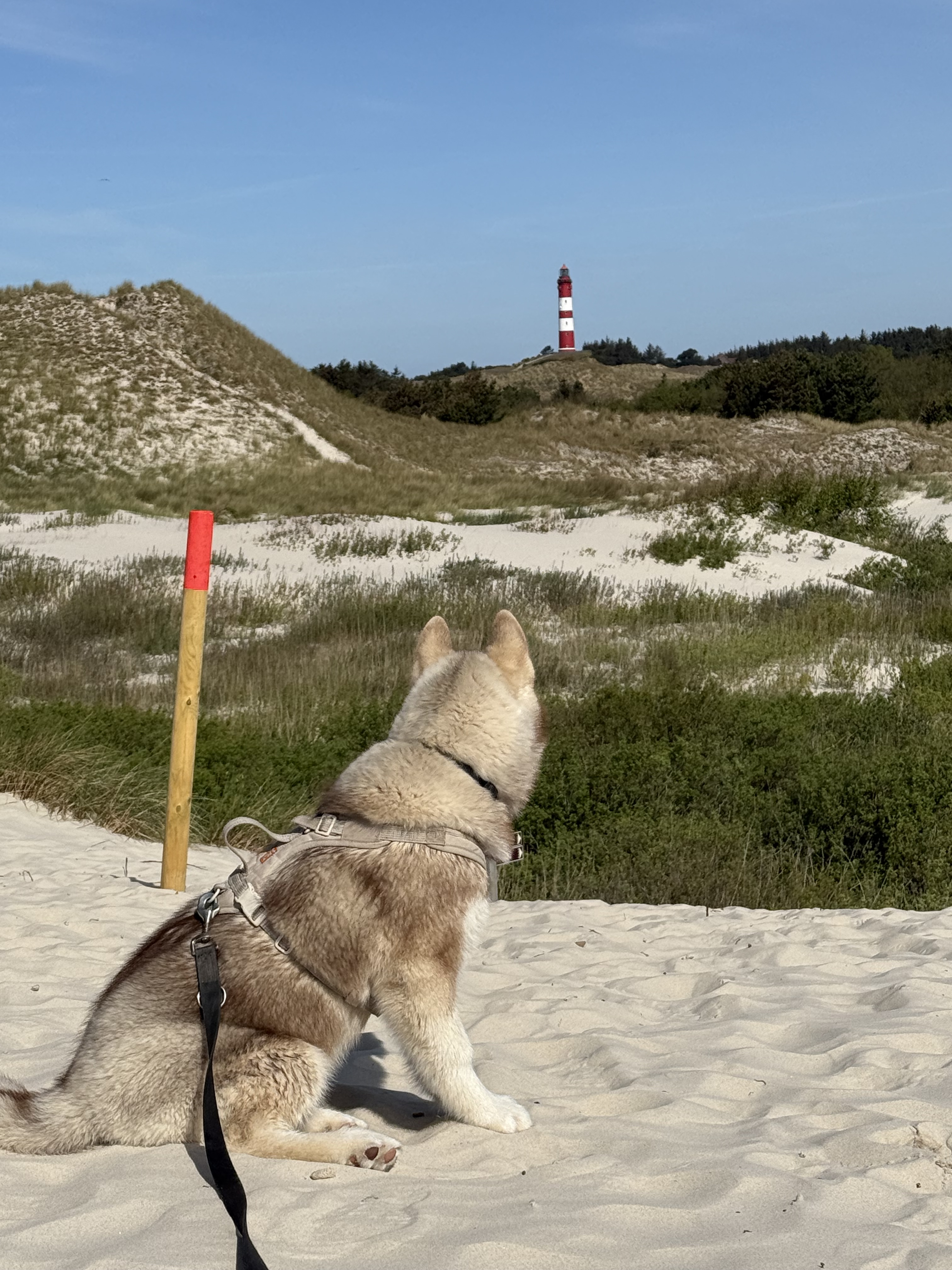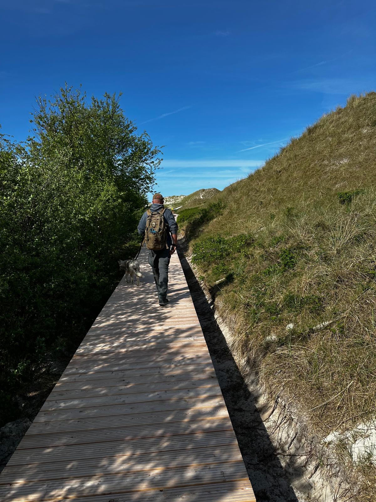 Es wird mal wieder Zeit für einige Updates unserer Reise. Bordhund Hans brauchte Aufmerksamkeit und Simone hatte zwei Wochen Urlaub. Eine schöne Zeit, in der wir unsere gemeinsame Reise noch intensiver genießen konnten. Als das Wetter zur weiteren Routenplanung passte, haben wir auf Helgoland die Leinen losgeworfen und Kurs auf AMRUM gesetzt. Kurz nach Verlassen des Vorhafens können wir die Segel setzen. Es ist immer ein toller Moment wenn der Wind in die Segel greift und sich seine Kraft auf das Boot überträgt. Die Segel werden getrimmt, Germane legt sich gemächlich auf die Seite und nimmt Fahrt auf. Sobald alles passt stoppen wir den Motor und genießen die Ruhe. Das Steuern überlassen wir dem Autopiloten, der kann das ohnehin besser. Hans scheint die ganze Angelegenheit weniger spannend zu finden. Er liegt auf der Bank im Cockpit und schläft. Für die Strecke von 35 Seemeilen brauchen wir sechs Stunden, spannend wird es erst bei der Ansteuerung. Seegatten sind die zur Nordsee liegenden Durchgänge zwischen den Inseln und dem dahinter liegenden Wattenmeer. Bedingt durch die Gezeiten fließen enorme Wassermassen durch diese Engstellen. Entsprechend veränderlich sind die Fahrwasser durch aufgespülte Sände. Die Strömungsgeschwindigkeit erreicht hier bis zu drei Knoten (5,56km/h), was bei entgegenstehendem Wind zu unangenehmen Wellengang führen kann. Seegatten sind nach wie vor berüchtigt und fordern immer wieder Opfer. Heute sind die Bedingungen optimal. Wir erreichen die Ansteuertonne zum Fahrwasser des Rütergatt pünktlich zum Kenterpunkt der Tide, haben ab jetzt auflaufendes Wasser und mitlaufende Strömung. Die Wassertiefen der Fahrwasser sind auch bei Niedrigwasser ausreichend für uns. Es teilt sich an der nordöstlichen Spitze von Amrum in ein Haupt – und Nebenfahrwasser, wobei letzteres nur noch mit Pricken gekennzeichnet ist. Das Hauptfahrwasser führt weiter nach Föhr und das Kleinere in den Amrumer Hafen, dem ein Fähranleger vorgelagert ist. Trotz an- und ablegender Fähren, ein- und auslaufender Yachten bleibt ausreichend Platz, solange alle die Nerven bewahren und sich an die Regeln halten. Wir finden einen schönen Liegeplatz wo wir längsseits festmachen können und begeben uns mit Segelhusky Hans auf Landgang. Wir kennen Amrum noch von unserem letzten Besuch im Jahr 2020, auch dieses Mal sind wir wieder von den kilometerlangen weißen Sandstränden begeistert. Hans genießt es in vollen Zügen. Hier kann er durch die Dünen toben, den Strand entlang laufen und mit den Wellen spielen. Es macht Freude ihn dabei zu beobachten und auch wir genießen unsere Zeit.