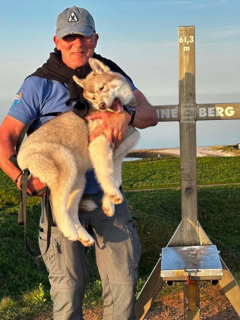Hans ist hier mittlerweile bekannt wie ein Pop Star und löst die dollsten Reaktionen aus. Letztens kam uns eine Gruppe von fünf Offshore Arbeitern entgegen. Alles große Kerle, behangen mit Gurt- und Kletterzeug. Wie auf Kommando knieten sie sich gleichzeitig hin, um Husky Welpe Hans zu streicheln. Der kleine Hund muss denken, dass er ein Star ist. Überall durchweg positive Resonanz wie: „Ist der süß…“, „Ist das ein Wolf?“, Das ist aber ein schöner Husky…“ , „damit lernt man aber Frauen kennen…“ 😉 An das Bordleben hat er sich gewöhnt. Er klettert ganz selbstverständlich an und von Bord. Er macht auf sich aufmerksam wenn er sein Geschäft verrichten muss und hat bislang (noch) nichts zerstört (teu, teu, teu). Vom Bootfahren ist er noch nicht ganz überzeugt. Als wir gestern den Motor angeworfen haben, um zur Tankstelle zu fahren, hat er protestiert und wollte lieber an Land gehen. Der Ausflug war aber schnell zu ende und die kleine Hundewelt wieder in Ordnung. Mal sehen wie er sich morgen verhält, wenn es weiter nach Amrum geht. Es sind eine Menge neue Eindrücke, die der kleine Hund im Alter von nur vier Monaten zu verarbeiten hat und wir sind froh so einen so umweltsicheren Hund zu haben. Derzeit ist Hans in der Zahnung und ihm schmerzt die Kauleiste. Die kleinen spitzen Milchzähne werden durch die Bleibenden ersetzt. Dies äußert sich auch dadurch, dass Hans ständig an uns herumkaut und sich seiner Beißkraft nicht immer bewusst ist.