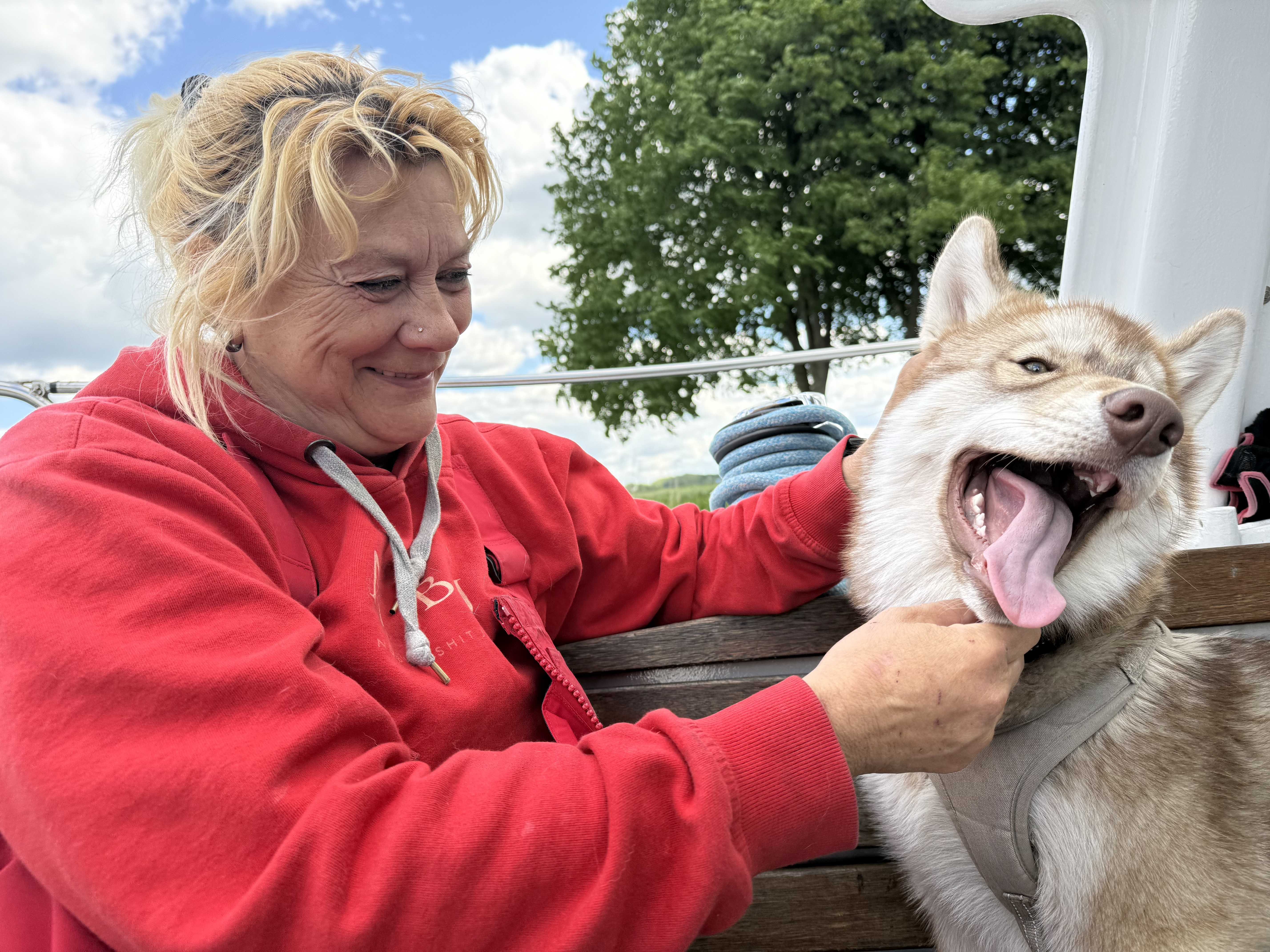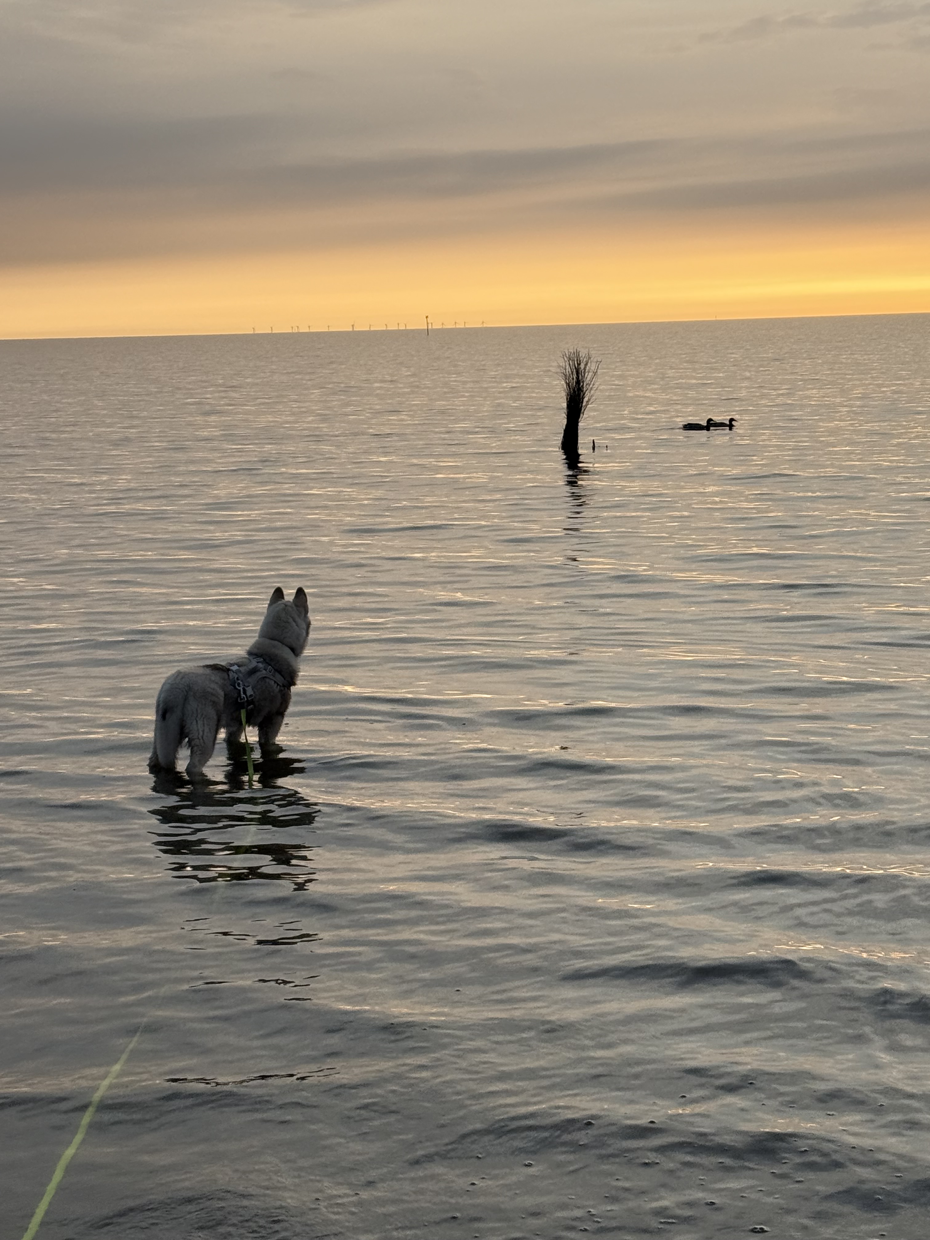 Der Hafen von Tönning ist ganz nett, fällt bei Niedrigwasser aber trocken. Wir haben längsseits an einem Schwimmsteg festgemacht, der weniger Tiefgang als Germane hat. Während Germane schon auf Grund liegt, bewegt sich der Steg noch weiter nach unten bis auch er auf Grund liegt. Unsere Festmacherleinen sind jetzt so stramm, dass man darauf Geige spielen könnte. Das Gewicht des Steges zieht Germane zusätzlich auf die Seite. Erst dadurch werden wir gewahr, dass wir uns zu eng angebunden haben. Als wir die Leinen lösen ändert dies nichts mehr an der schiefen Lage, wir müssen die nächsten Stunden recht ungemütlich in unserem schrägen Zuhause verbringen. Für Bord- und Segelhusky Hans sind das wieder viele neue Eindrücke in seinem jungen Leben. Ein schiefer Liegeplatz, eine schmale Steganlage mit einer Rampe als Landverbindung, die bei Niedrigwasser so steil wie eine Leiter ist. Bei der 24Uhr Gassi-Runde mussten wir 1,5 Stunden auf Wasser warten bis die Rampe wieder in einem Winkel stand, dass wir gemeinsam zur Steganlage herabsteigen konnten.