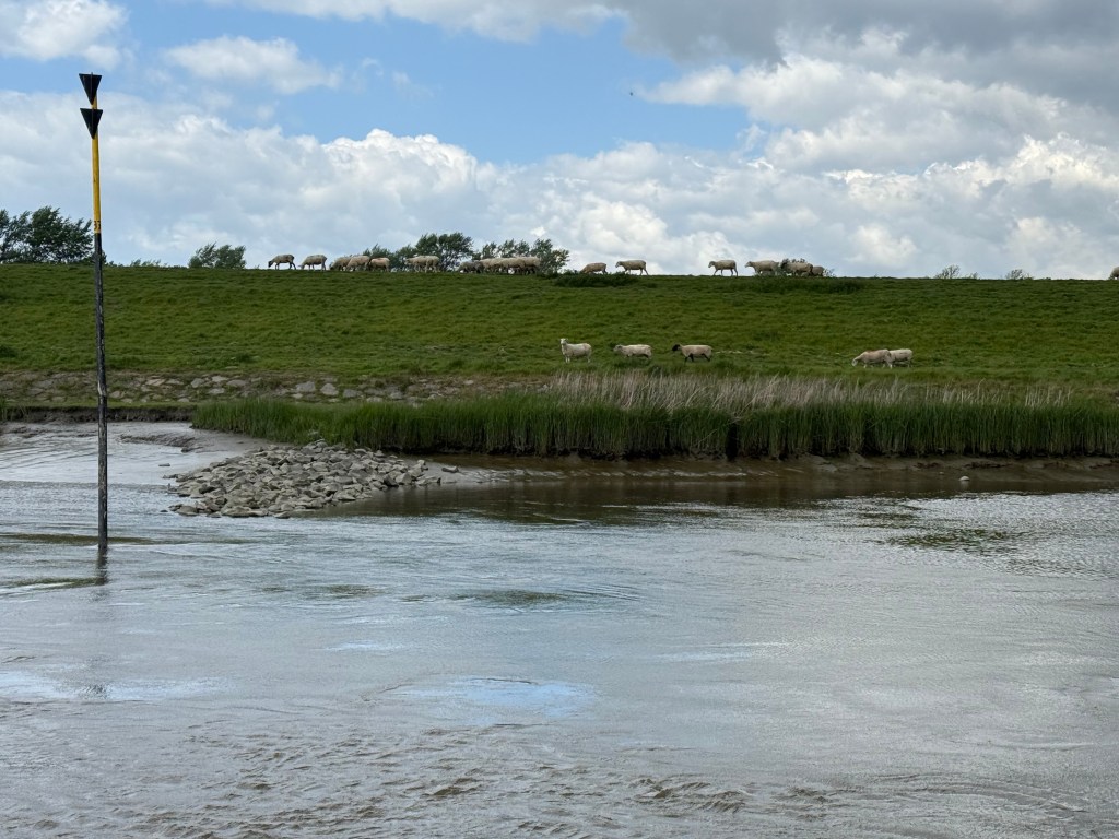 Die Windrichtung sprach für einen südlichen Kurs, somit entfiel die Option für Schickimicki auf SYLT. Weil es sich falsch anfühlt während einer Reise am Ausgangshafen vorbei zu segeln haben wir uns entschieden durch die Eider in den Nord- Ostsee Kanal zu fahren. Dies ist navigatorisch anspruchsvoller, da wir zur passenden Zeit am passenden Ort sein müssen. Auf der vor uns liegenden Strecke ist nur mit dem richtigen Timing sichergestellt, dass immer ausreichend Wasser unterm Kiel ist. Weiterhin sind ein Sperrwerk, mehrere Brücken und Schleusen zu durchfahren. Eine gewissenhafte Routenplanung ist Voraussetzung, um die Strecke ohne böse Überraschungen zu meistern. Wer will schon im Tidengewässer vor einer Brücke liegen die nicht öffnet, weil gerade Betriebsferien sind oder irgendein technischer Defekt vorliegt. Das dieses Verständnis zur Routenplanung nicht allzu weit verbreitet ist wird an der Reaktion des Schleusenwärters im Eidersperrwerk deutlich. Das wäre doch mal was Besonderes, dass sich jemand im Voraus meldet und seine Route plant. Zu oft gäbe es Wassersportler die sich unvorbereitet auf die Reise begeben und von zuvor veröffentlichen Änderungen überrascht werden. Er gibt uns noch einige wertvolle Tipps, u.a. wo wir nautische Bekanntmachungen für den gewählten Streckenabschnitt online abrufen können. In dem sehr netten und informativen Gespräch stellt sich heraus, dass er selber Wassersportler ist und sich am Wochenende auch mit seiner Motoryacht auf der Eider befinden wird.