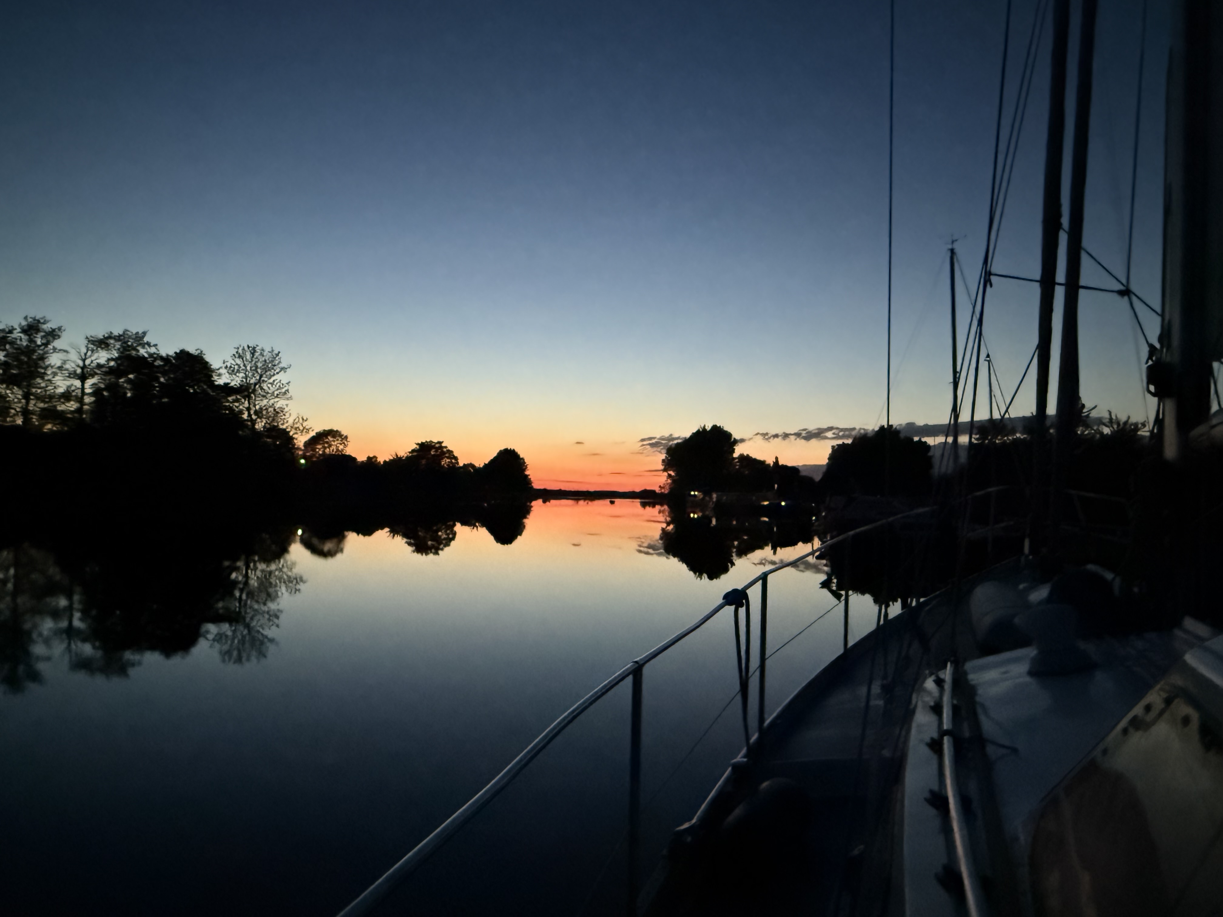 Simone kann mit weiblichem Charme den Brückenwärter in Pahlhude überreden noch 15 Minuten nach seiner Bereitschaftszeit auf uns zu warten. Nachdem wir diese passiert haben liegt nur noch die Gieselau- Schleuse zwischen uns und dem Nord- Ostseekanal. Wir genießen die Fahrt durch die schöne Natur entlang der Eider. Überall gibt es was zu sehen. Greifvögel ziehen ihre Kreise, hier und dort steht eine Kuhherde am Wasser und an idyllischen Plätzen haben Angler ihr Zelt aufgeschlagen. Eine durchweg friedliche Atmosphäre in toller Landschaft. Als es langsam auf den Sonnenuntergang zugeht machen wir uns Sorgen um einen Liegeplatz für die Nacht. Bislang haben wir noch keine geeignete Stelle finden können, alle Liegeplätze waren entweder belegt oder zu klein. Als wir in den Bereich der Hohner Fähre kommen, ist bei dem dortigen Wassersportclub eine Party im vollen Gange. Als wir herüberrufen und nach einem Liegeplatz für die Nacht fragen, werden wir freundlich herüber gewunken. Wir dürfen am Clubheim längsseits festmachen und werden zum Anlegebier eingeladen. Hier treffen wir auch den netten Schleusenwärter vom Eidersperrwerk, mit dem wir für unsere Routenplanung telefoniert hatten. Es folgt ein bunter Abend zwischen Feuerschale, Grill und Germanes Cockpit. Solche Momente sind unbezahlbar und machen das Reisen aus. Wir machen nette neue Bekanntschaften und werden vielleicht noch unsere Route anpassen, um auf AERO Rasen zu mähen.
