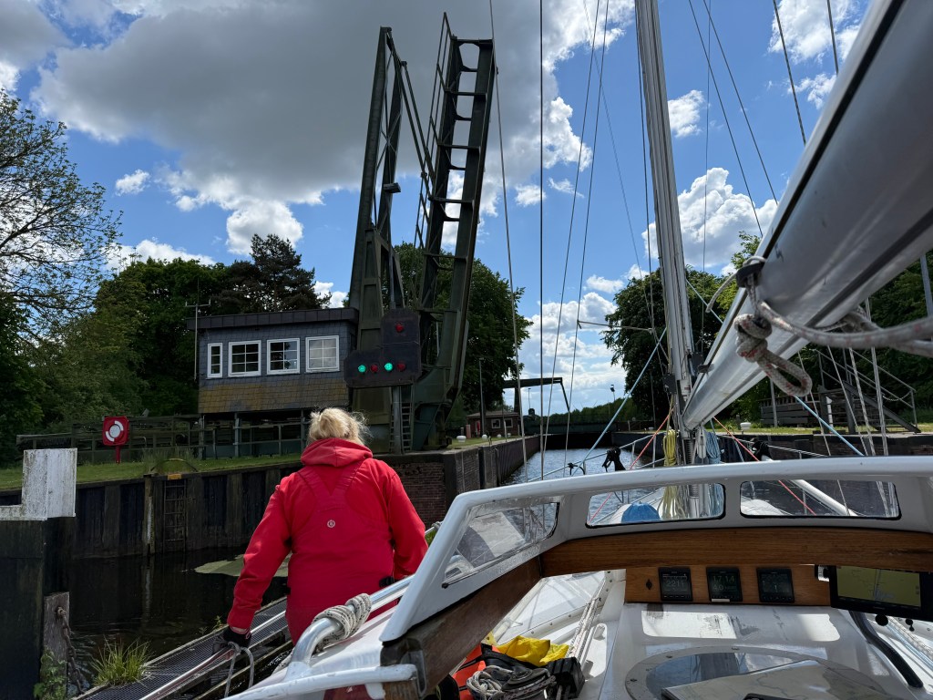 Gegen Mittag schwamm Germane bei einer Wassertiefe von 1,30m wieder auf. Von jetzt an verblieben uns noch etwa 3 Stunden mit auflaufendem Wasser. Rechnerisch also genug Zeit um die 11 Meilen bis zur Schleuse in die Binneneider zu schaffen. Die einzig Unbekannte dabei sind die Öffnungen der drei zwischenliegenden Brücken. Die erste Klappbrücke bei Tönning informieren noch vor Ablegen aus dem Hafen. Der Brückenwärter sagt, dass er die Brücke öffnet sobald wir in Sicht kommen, um verzugslos durchfahren zu können. Alles klappt wie abgesprochen, nur die Lichtsignale bleiben auf Rot stehen. Während uns die Strömung auf die Brücke zuschiebt hoffen wir auf grünes Licht, welches aber aus irgendwelchen Gründen nicht geschaltet wird. Wir müssen zwischen den Leitwehren aufstoppen und gegen die Strömung volle Kraft zurück geben. Germane läuft aufgrund seiner Bauart nicht kursstabil rückwärts. Mit viel Mühe, Glück und Einsatz des Bugstrahlruders können wir Germane drehen, um vor der Brücke noch einen Kreis zu fahren. Erst jetzt werden die Lichtsignale auf Gün geschaltet und die Durchfahrt freigegeben. Woran die Freigabe gehapert hat werden wir wohl nie erfahren, einfach durchzufahren wäre aber das letzte Mittel zur Wahl gewesen. Es gibt Vorfälle von abgebrochen Masten an sich schließenden Brücken, hier wollen wir uns nicht einreihen. Der weitere Fahrwasserverlauf der Tideneider ist landschaftlich schön und navigatorisch aufregend. Mit sieben Knoten schlängeln wir uns dem dürftig markierten Fahrwasser entlang und haben den Tiefenmesser stets im Auge. Die Wassertiefe variiert zwischen zwei und vier Metern, was eigentlich ausreichend ist. Im Hinterkopf fährt aber die Gewissheit mit, dass die verbleibenden 70cm Wassertiefe bei einer Untiefe schnell weg sind. Etwa 30 Minuten vorher informieren wir die Eisenbahnbrücke Friedrichstadt über unsere berechnete Ankunftszeit. Die nette Brückenwärterin sagt, dass sie frühestens in 50Minuten öffnen kann weil noch ein Zug mit Verspätung erwartet wird 🙂 Wir reduzieren unsere Geschwindigkeit und können fast verzugslos bei Ankunft durchfahren. Auch die Öffnung der nächsten Straßenbrücke klappt nach vorheriger Absprache verzugslos. Es ist immer wieder beeindruckend wenn sich diese riesigen Bauwerke öffnen. Besonders freut uns dabei, dass sie das kostenlos machen. Als wir gegen 18 Uhr mit der Schleuse Nordfeld die Tideneider verlassen sind wir erstmal froh das Gezeitenrevier hinter uns gelassen zu haben. Ab jetzt haben wir recht gleichbleibende Wasserstände und kaum Strömung. Unsere künftige Routenplanung wird uns also nicht mehr mitten in der Nacht starten lassen, selbst die Gassi-Runden für Hans sind ab jetzt Tiden unabhängig.