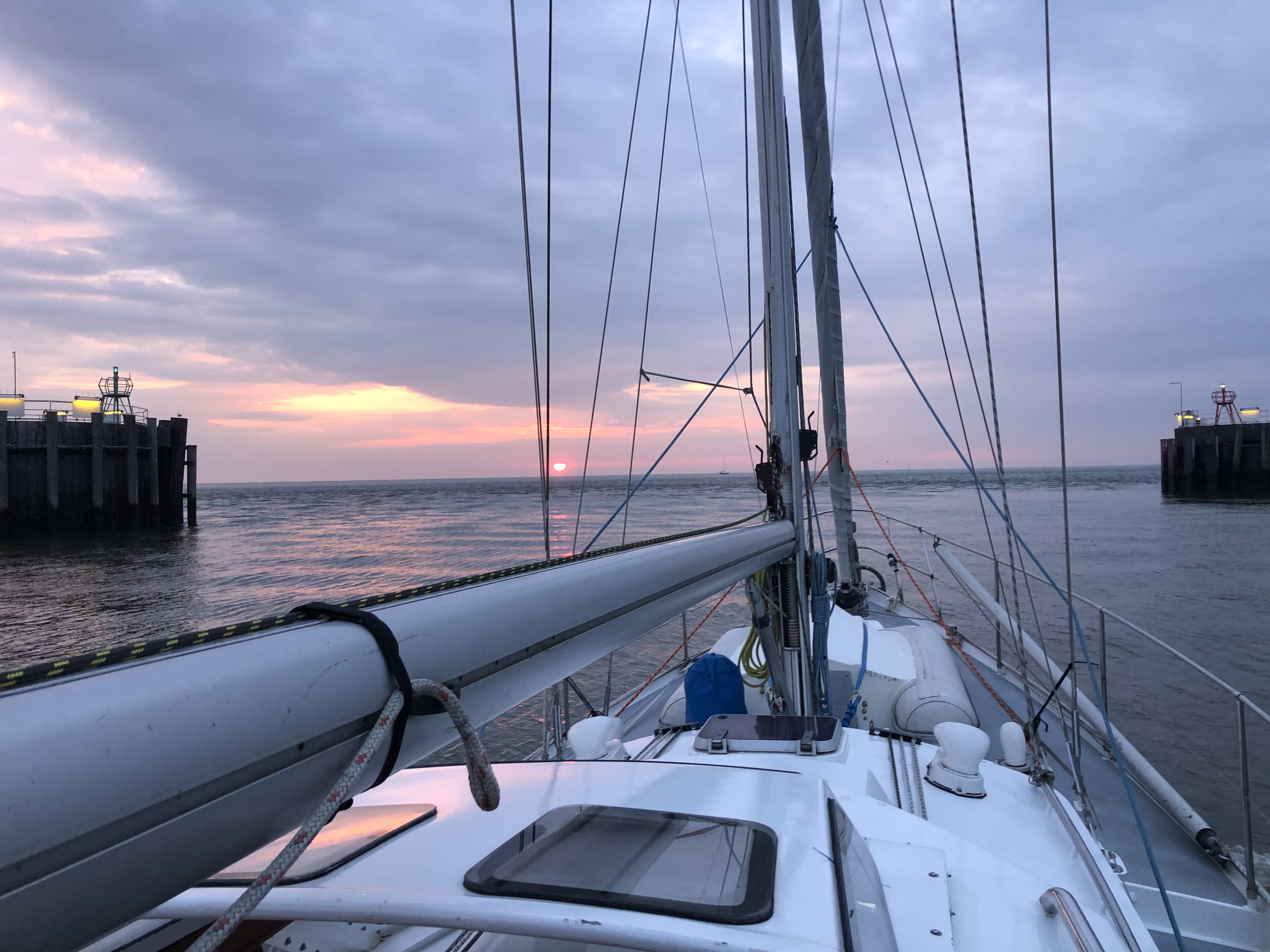 Beginn unserer diesjährigen Reise. Um 6 Uhr ging es vom Cuxhavener Schleusenpriel durch die Klappbrücke in Richtung See. Es ist tolles Gefühl wieder die Leinen losgeworfen zu haben, um auf Germane für die nächsten Monate nach Norden zu segeln. Für die heutige Etappe nach Helgoland sind 3-4 Bft achterlicher Wind vorhergesagt, entsprechend ruhig ist die See. Mit ablaufendem Wasser fahren wir bei Sonnenaufgang aus dem Vorhafen heraus auf die Elbe. Der Ebbstrom nimmt uns mit und wir machen im Fahrwasser der Elbe 10Knoten Geschwindigkeit über Grund. Nachdem wir das Fahrwasser verlassen haben und uns auf offener See befinden lassen wir unter Segeln den Motor noch mitlaufen. Der schwache achterliche Wind alleine würde nicht ausreichen, um heute noch bei Tageslicht auf Helgoland anzukommen. So laufen wir nach fünf Stunden Überfahrt auf Helgoland ein und können uns einen schönen Liegeplatz direkt am Steg sichern. Hier werden wir für die nächsten 10 Tage bleiben, da es hier neben einigen Tagen Boat-Office noch eine große Herausforderung zu bewältigen gibt. Dazu in einem späteren Beitrag mehr (Nach dem Motto erst machen dann schnacken). Wir sind immer wieder begeistert von dieser Insel. Ein toller Ort, um Natur zu erleben, herunterzukommen und in den Reisemodus zu wechseln.