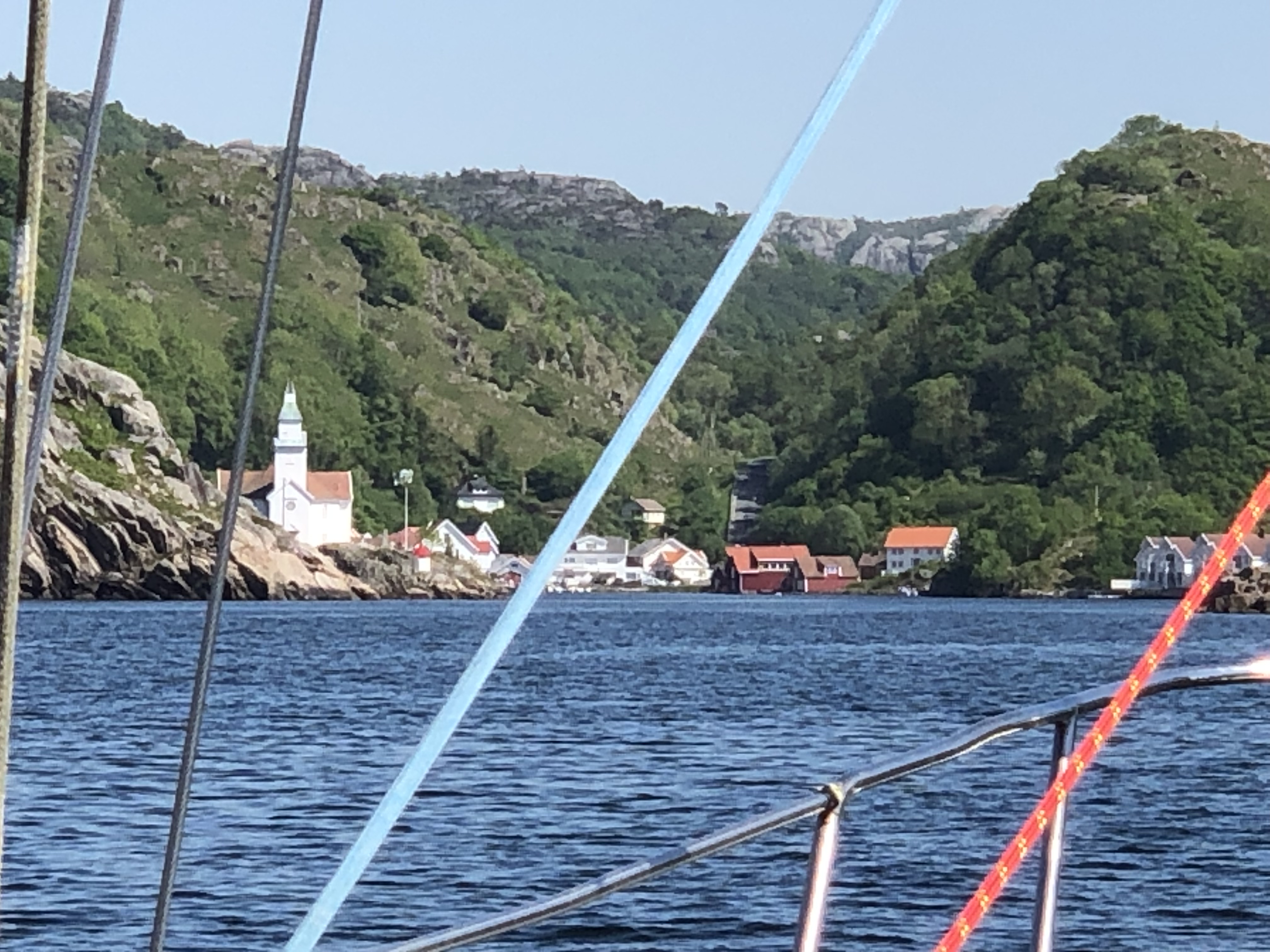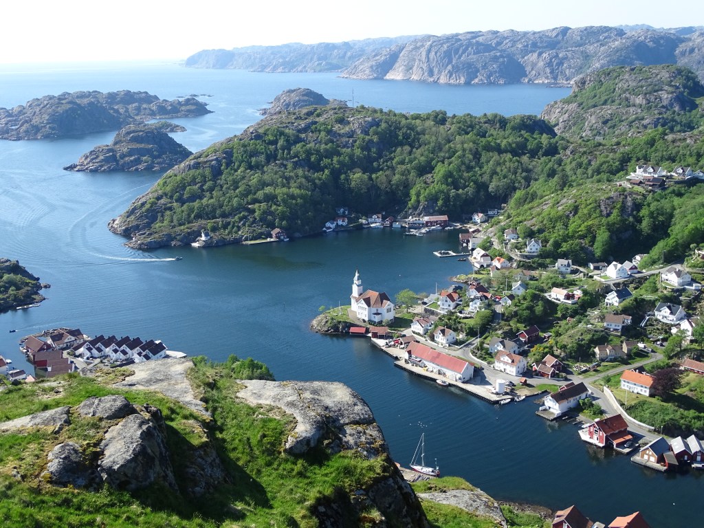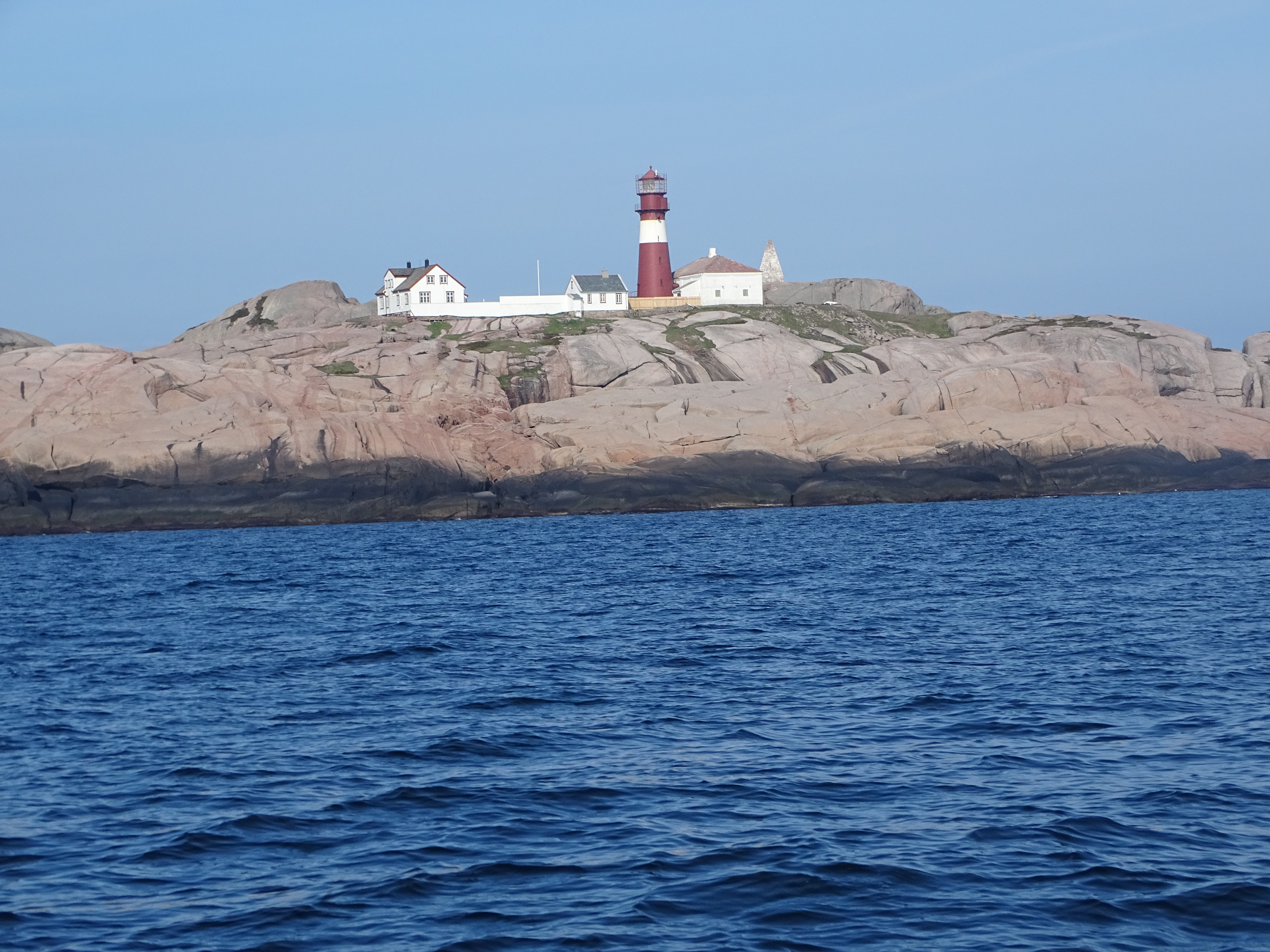42 Seemeilen weiter nach Westen und die Berge werden höher. Bei glatter See passieren wir KAP LINDESNESS, den südlichsten Punkt Norwegens. Immer wenn die See glatt ist fehlt leider auch der Wind zum Segeln, man kann halt nicht alles haben. Ein kleines Stück werden wir von einem Schweinswal begleitet, der in einiger Entfernung mit seiner Rückenflosse auf sich aufmerksam macht. Die Zufahrt auf KIRKEHAMN ist immer wieder spannend. Da wir diese Zufahrt bereits kennen, können wir sie diesmal richtig genießen. Von See kommend geht es direkt auf die felsige Küste zu. Die Zufahrt zu dem versteckten Ort zeigt sich erst, als das kleine Leuchtfeuer steuerbordseitig passiert wird. Nach acht Stunden auf See machen wir am Gästepier im Gemeindehafen fest. Der Liegeplatz ist einfach, ohne Sanitäranlagen, Wasser und Strom, dafür aber umsonst. Durch die Motorstunden der Überfahrt sind unsere Batterien voll geladen, den weiteren Energiebedarf decken wir mit unseren Solarpanelen. Hier werden wir den vorhergesagten Starkwind aus nordwestlicher Richtung (genau die Richtung in die wir wollen) abwettern und danach unsere Reise fortsetzen. Bei der Erkundung ehemaliger Stellungen des Atlantikwalls bietet sich ein grandioser Blick über den Ort und entlang der felsigen Küste. Ein weiterer feiner Ort unserer Reise, der keine Hetze zur Weiterfahrt aufkommen lässt.