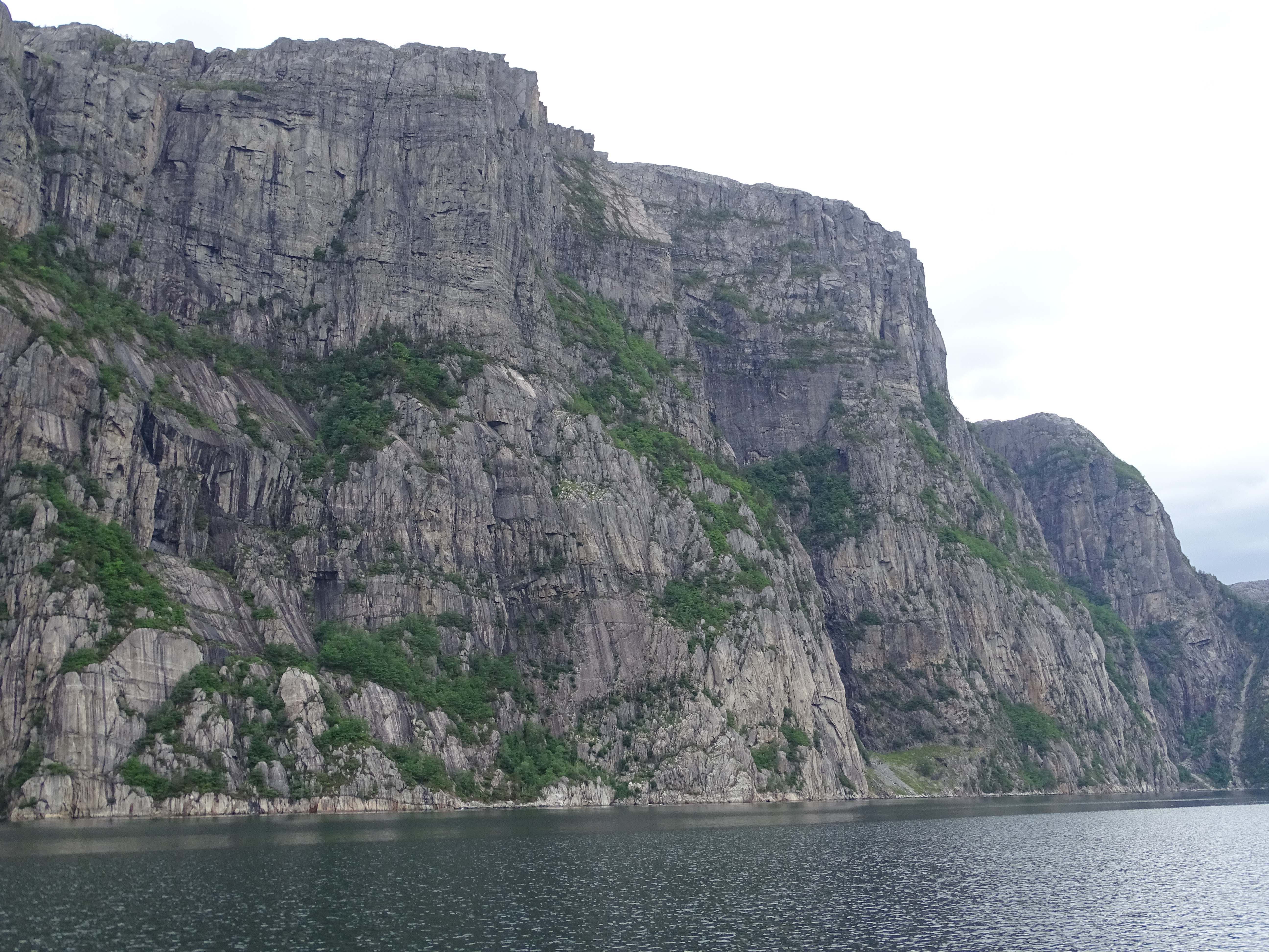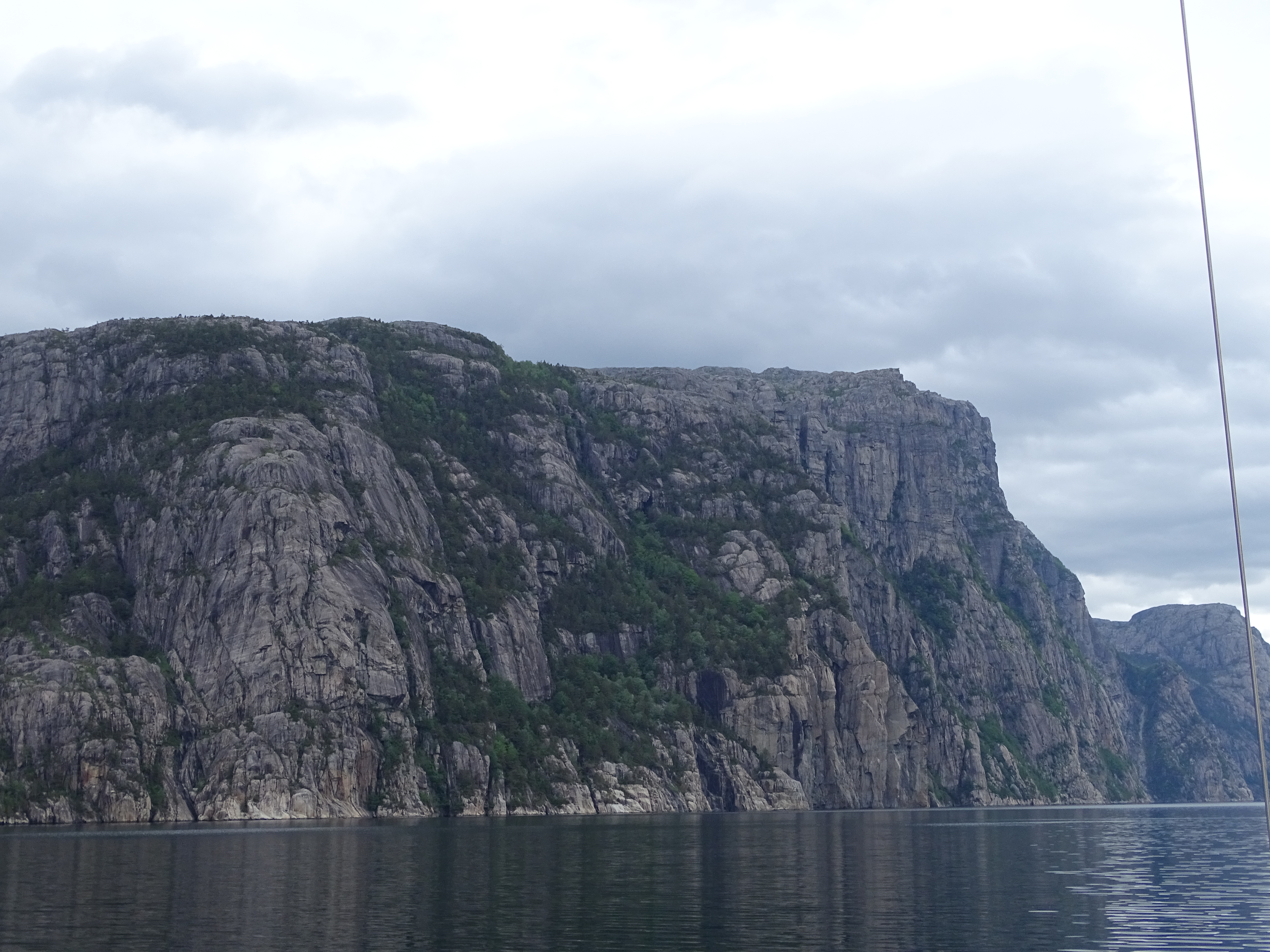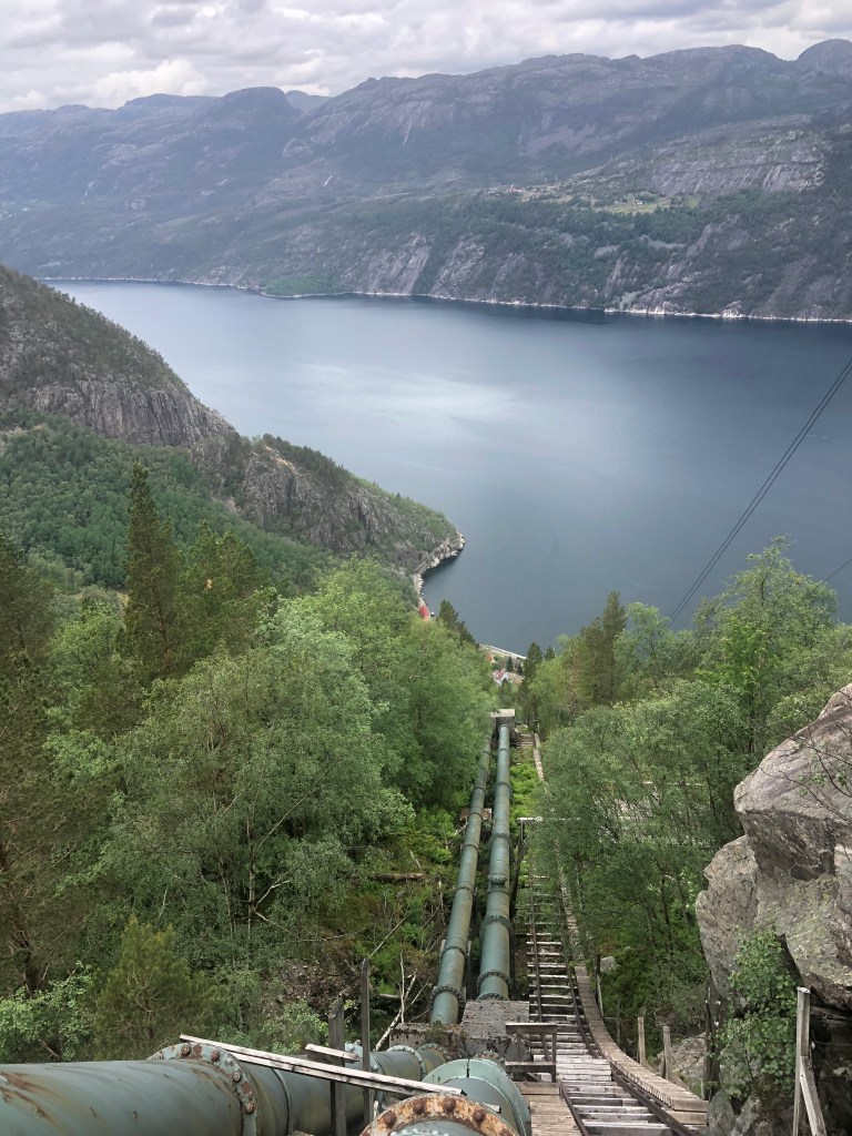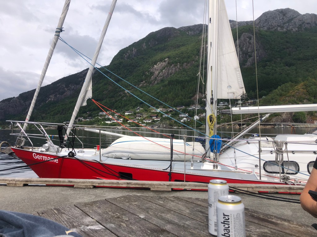 Ein kleiner gemütlicher Hafen am Eingang zum LYSEFJORD. Von hier aus soll es am nächsten Tag weiter nach FLØRLI gehen. In diesem Fjord waren wir schon 2022, hatten damals aber nicht mehr genügend Zeit, um die längste Treppe der Welt zu bezwingen. Dies wollen wir morgen nachholen, wollten aber nicht die Nacht an dem ungeschützten Liegeplatz vor dem alten Wasserkraftwerk verbringen. Zu negativ sind uns noch die Schnellfähren in Erinnerung die beim Vorbeifahren und Anlegen eine Menge Wellen verursachen. Hier liegen wir gut geschützt vor einem kleinen Supermarkt, den ausbleibenden Schwell der Fähren übernehmen nun aber die einheimischen Jugendlichen mit ihren Ribs. Diese kleinen Boote sind mit 10PS Außenbordmotoren ausgestattet, führerscheinfrei und sicherlich der Traum von jedem Teenie. Anfangs bestaunten wir das lustige Treiben noch auf Entfernung und mit Wohlwollen. Als sich die Truppe jedoch entschlossen hat enge Kreise neben unserem Boot zu fahren kippte an Bord neben unseren Bierdosen auch die wohlgesonnene Stimmung. Germane fing derart an zu schaukeln, dass er feste in die Leinen ruckte, unter Deck einiges umfiel und ein Fender platzte. Das die Bengels mein Englisch nicht verstanden mag an deren fehlenden Wortschatz gelegen haben den ich nutzte, um meinen Unmut kundzutun. Der Ärger war aber genau so schnell verflogen wie er gekommen war. Am nächsten Morgen lernten wir noch zwei Tramperinnen aus Australien und Frankreich kennen. Die beiden 22jährigen Mädels sind mit Rucksack auf Entdeckungsreise in Norwegen. Als sie hörten, dass wir nach FLØRLI wollen fingen ihre Augen an zu leuchten und sie baten uns sie mitzunehmen. Ein Wunsch den wir nicht ausschlagen konnten. Es war eine Freude zu sehen wie sehr sie die Tour im Fjord genossen. Die Perspektiven die sich vom Boot aus bieten sind anders nicht zu erleben. Wir dieseln an Seehunden vorbei, die uns neben einer Lachsfarm neugierig beäugen. Weiter geht es entlang der steilen Felswände mit kleineren Wasserfällen, vorbei an dem bekannten Felssplateau PREIKESTOLEN (Pulpit Rock) bis zum alten Wasserkraftwerk in FLORLI. Hier können wir die Heckleinen an einer Boje festmachen und mit dem Bug voraus an einen Holzanleger fahren. Freundlicherweise werden unsere Bugleinen von der Crew des Katamarans BREINWAVE angenommen. Das macht das Anlegen deutlich einfacher, weil niemand übersteigen muss, um die Leinen durch die vorgesehenen Befestigungspunkte an Land zu ziehen. Nach einem kurzen Stegschnack trennen sich unsere Wege und auch die beiden Mädels ziehen glücklich weiter.