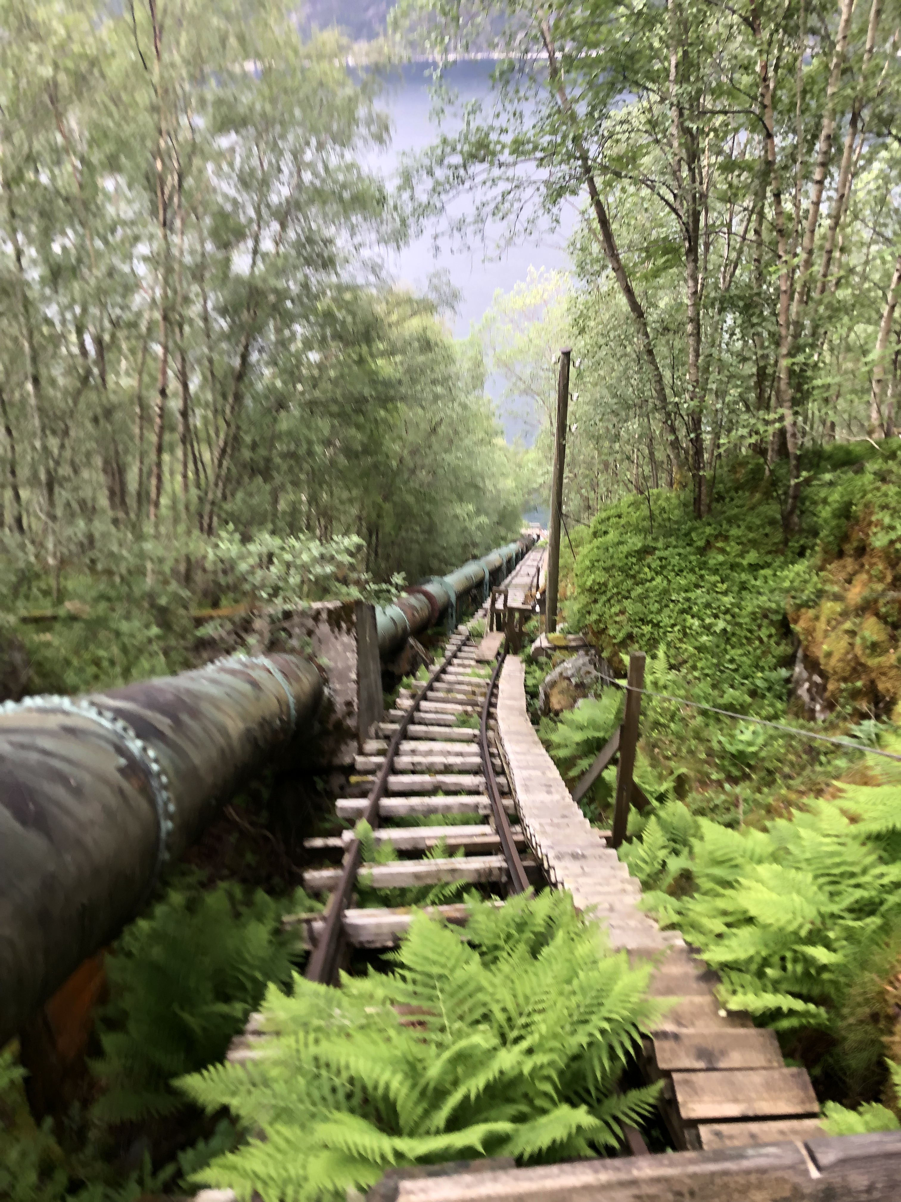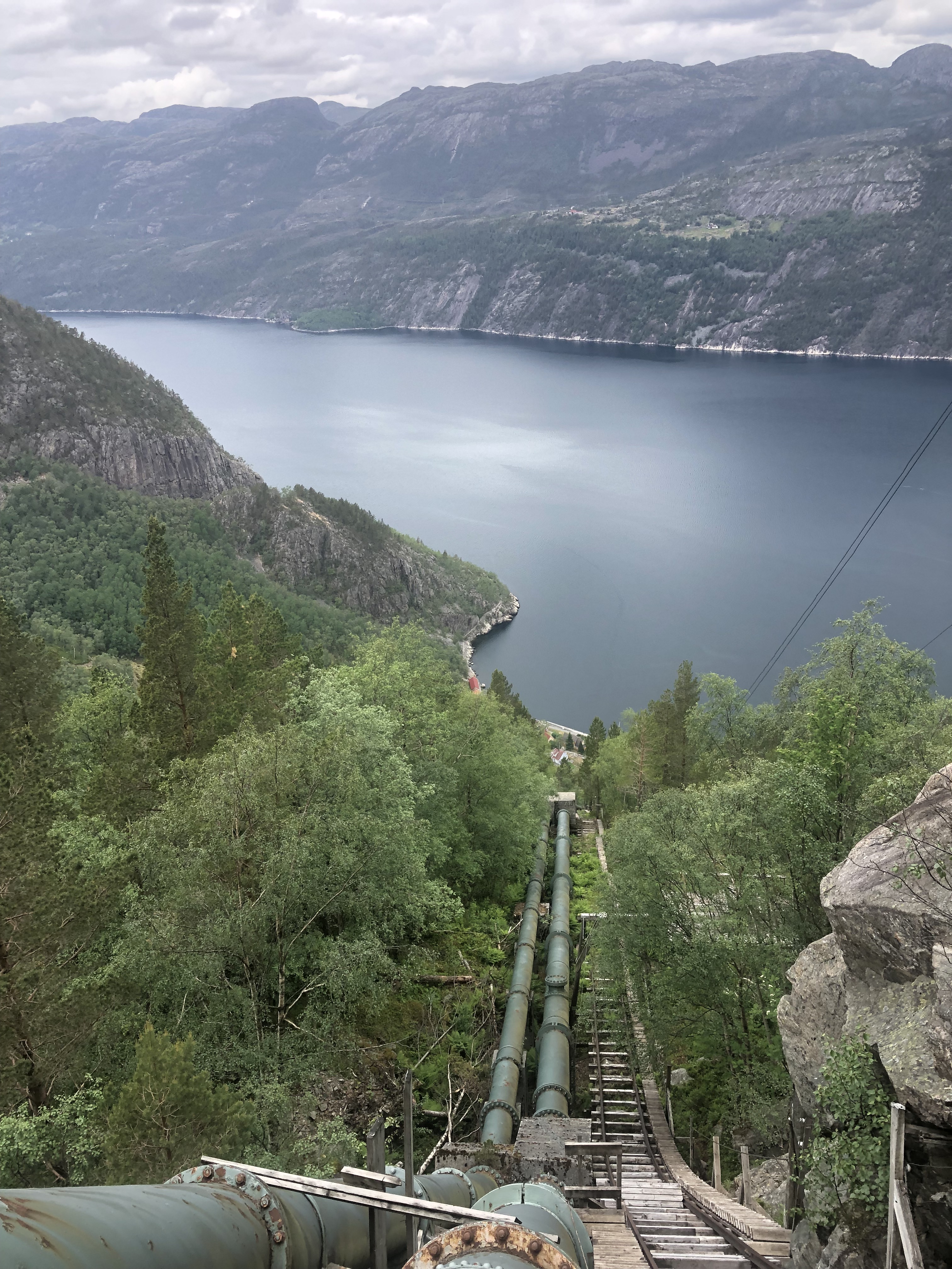 FlØRLI besteht aus einem stillgelegten Wasserkraftwerk und einigen Ferienhäusern. Der Ort ist nur mit dem Boot oder zu Fuß über die Berge zu erreichen. Entlang der Wasserrohre, die das Wasser aus dem Bergsee in das Turbinenhaus leiten, führt eine Holztreppe mit 4444 Stufen hinauf auf 721 Meter. Da dies angeblich die längste Holztreppe der Welt ist müssen wir da hoch! Der Rundweg über 5km Länge soll laut Beschreibung in durchschnittlich 4Stunden zu schaffen sein. Etwas skeptisch aufgrund unserer Erfahrungen mit norwegischen Beschreibungen machen wir uns auf den Weg. Sicherlich kommt uns zugute, dass wir noch etwas Kondition vom Helgoland Marathon erhalten haben. Es wäre aber gelogen, wenn wir bei Stufe 800 nicht mit brennenden Oberschenkeln die angebotene Abkürzung in Betracht gezogen hätten. So geht es von dort aus auch für Dirk alleine weiter. Eigentlich ist die Treppe sehr gut ausgebaut. Die Stufen sind ausreichend groß und nicht zu weit auseinander. Überall findet man guten Halt und dort wo es steiler wird sind Geländer oder Stahlseile zum Festhalten angebracht. Wer jedoch Höhenangst hat sollte es sich vorher gut überlegen, denn irgendwann ist der „Point of no Return“ überwunden und es geht nur noch bergauf. Es wird in allen Beschreibungen abgeraten die Treppe zurück zu gehen. In Norwegen wird aber glücklicherweise auf Eigenverantwortung gesetzt. Es gibt eine Beschreibung, vielleicht noch ein Hinweisschild, mehr aber nicht. Kein Kassenhäuschen, keine Aufsichten oder Absperrungen. Unterwegs bietet sich ein grandioser Blick auf den Fjord. An einer Stelle konnte ich entlang der Holztreppe direkt auf Germane schauen. Das perfekte Foto im Sinn ging ich davon aus, dass sich dieses Motiv weiter oben noch spektakulärer darstellen sollte. Dem war leider nicht so und ich war zu faul/ kaputt, um nochmals für ein Foto abzusteigen (Ist ja schließlich ins Hirn gebrannt 😉 Oben angekommen stellte ich fest, dass ich für die 4444 Stufen und 721 Höhenmeter knapp 2 Kilometer zurück gelegt habe. Da der Rundweg insgesamt 5 Kilometer lang ist waren die verbleibenden 3 Kilometer bergab „über Stock und Stein“ auch nicht gerade erholsam. Dennoch bot sich unterwegs wieder einzigartige Natur, die trotz aller Anstrengungen zu genießen war. Kleine Hängebrücken führten über rauschende Bäche, Felslandschaften und bewaldete Steilhänge lösten sich ab. Der Weg war gut gekennzeichnet und nach 3,5h war der Rundweg geschafft. Nach einer kurzen Verschnaufpause haben wir abgelegt und sind für die Nacht zurück in den kleinen geschützten Hafen nach FORSAND gefahren.