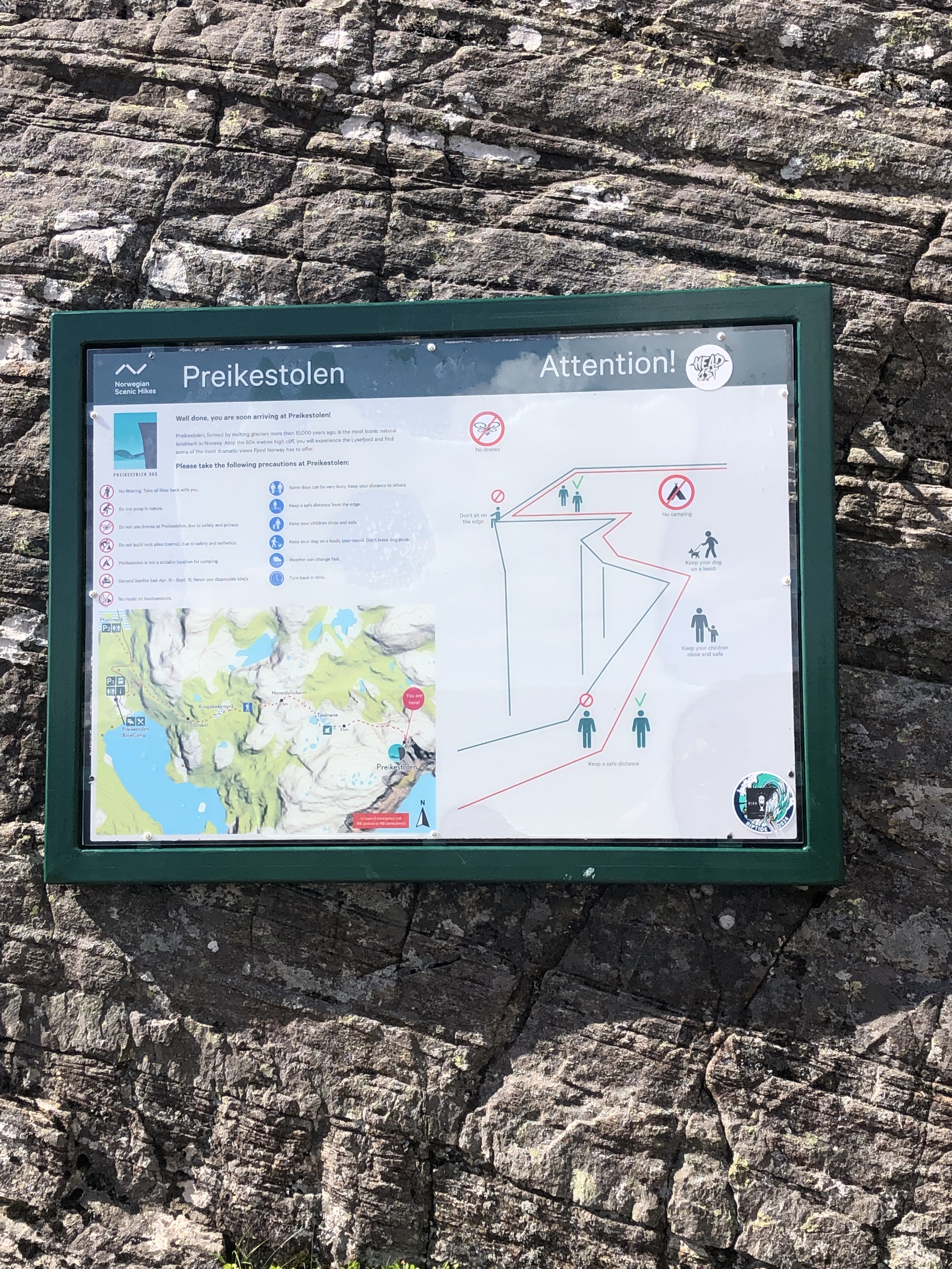 Heute haben wir auf die Weiterfahrt verzichtet und das gute Wetter für einen Ausflug zum Preikestolen genutzt. Wir haben ihn schon viermal auf eigenem Kiel passiert, nun ist es an der Zeit ihn auch zu besteigen. Es handelt sich beim Preikestolen um ein Felsplateau von 25m x 25m in 600m Höhe über dem Lysefjord. Mit seinen senkrecht abfallenden Wänden ist er wohl eines der meist fotografierten Sehenswürdigkeiten Norwegens. Jährlich zieht es tausende Touristen nach oben, um dort ein möglichst spektakuläres Selfie zu schießen. Da wir uns noch in der Vorsaison befinden hoffen wir darauf, dass es heute nicht zu überfüllt ist. Per vollbesetzten Expressbus geht es morgens um acht Uhr in Stavanger los. Am sogenannten Basislager (ein großes Wort für diese Touri-Sammelstelle) angekommen entladen sich unzählige Reisegruppen aus weiteren Bussen. Es erstaunt uns wie viele Chinesen darunter sind. Der vier Kilometer lange Weg zum Plateau ist gut ausgebaut und geht stellenweise recht steil nach oben. Trotzdem hält dies nicht die Flut von Touristen auf, die sich in allen Körperformen und abenteuerlichstem Schuhwerk den Berg hinauf quälen. Die Landschaft um uns herum ist wieder einzigartig. Der Weg führt über Felsen, die vor vielen Jahren durch Gletschereis geformt wurden, an manchen Stellen bietet sich ein Blick in die Ferne. In dieser grandiosen Landschaft sorgt das Verhalten mancher Touries bei uns für völliges Unverständnis. Mit dem Handy in der Hand wird lautstark telefoniert und sich dabei rücksichtslos an Anderen vorbei gezwängt. Der vereinzelt am Wegesrand liegende Müll lässt darauf schließen wie es um so manchen Besucher gestellt ist. Dabei tuen sich die Nationen untereinander wenig. Bei den Deutschen fällt uns auf, dass sie ständig am meckern sind, die Niederländer halten nichts von Verboten und lassen in aller Ruhe ihre Drohne in der Verbotszone fliegen. Wir versuchen diese negativen Umstände so gut es geht auszublenden, genießen die Landschaft und lassen die Aussicht auf uns wirken. Wie schon im Bericht über FLØRlI beschrieben, ist auch hier wieder Eigenverantwortung gefragt. Es geht bereits auf den letzten Metern zum Ziel steil am Wegesrand bergab. Außer einem Hinweisschild mit einigen Verhaltensregeln und Gefahrenhinweisen ist nichts weiteres für die Sicherheit getan. Es verwundert daher nicht, dass hier regelmäßig Menschen in den Tod stürzen. Zuletzt haben wir am 03. Juni von einem tödlichen Unfall gehört. Auf dem Plateau angekommen herrscht buntes treiben. Überall wird sich möglichst spektakulär positioniert, um DAS FOTO von sich abzulichten. Es gibt kaum einen freien Stein auf dem nicht ein Chinese sitzt und fotografiert wird. Wir genießen kurz die grandiose Aussicht über den Fjord und machen uns auf den Rückweg, bevor die grölende britische Schulklasse oben ankommt. Nach knapp vier Stunden sind wir zurück am Ausgangspunkt und fahren zurück nach Stavanger. Alles zusammengefasst hat sich der Ausflug zum Preikestolen auf jeden Fall gelohnt. Die Aussicht von dort oben ist wirklich eindrucksvoll, die Massen an Touristen gehören aber auch dazu. In der Hochsaison wollten wir nicht dazwischen sein.