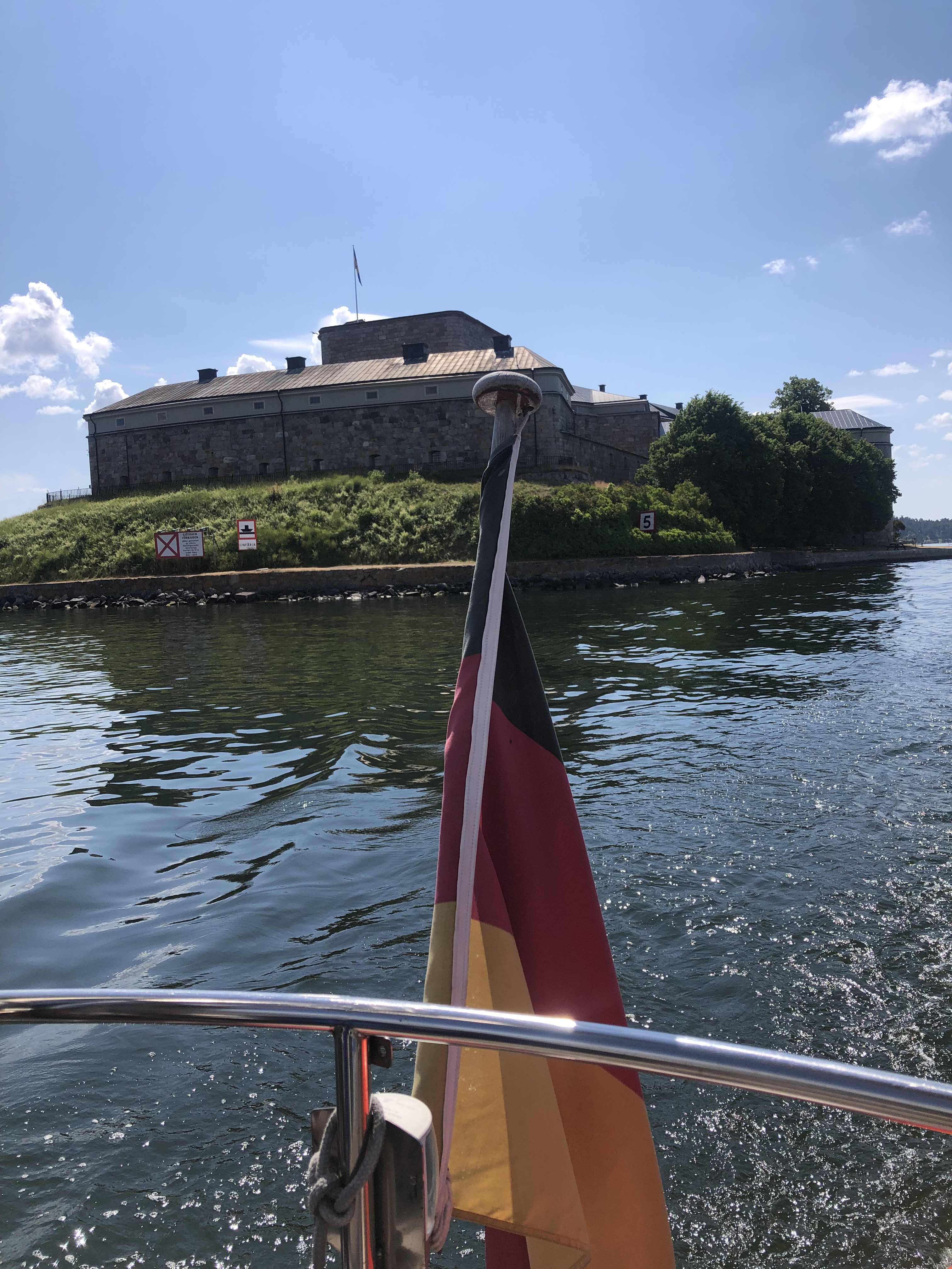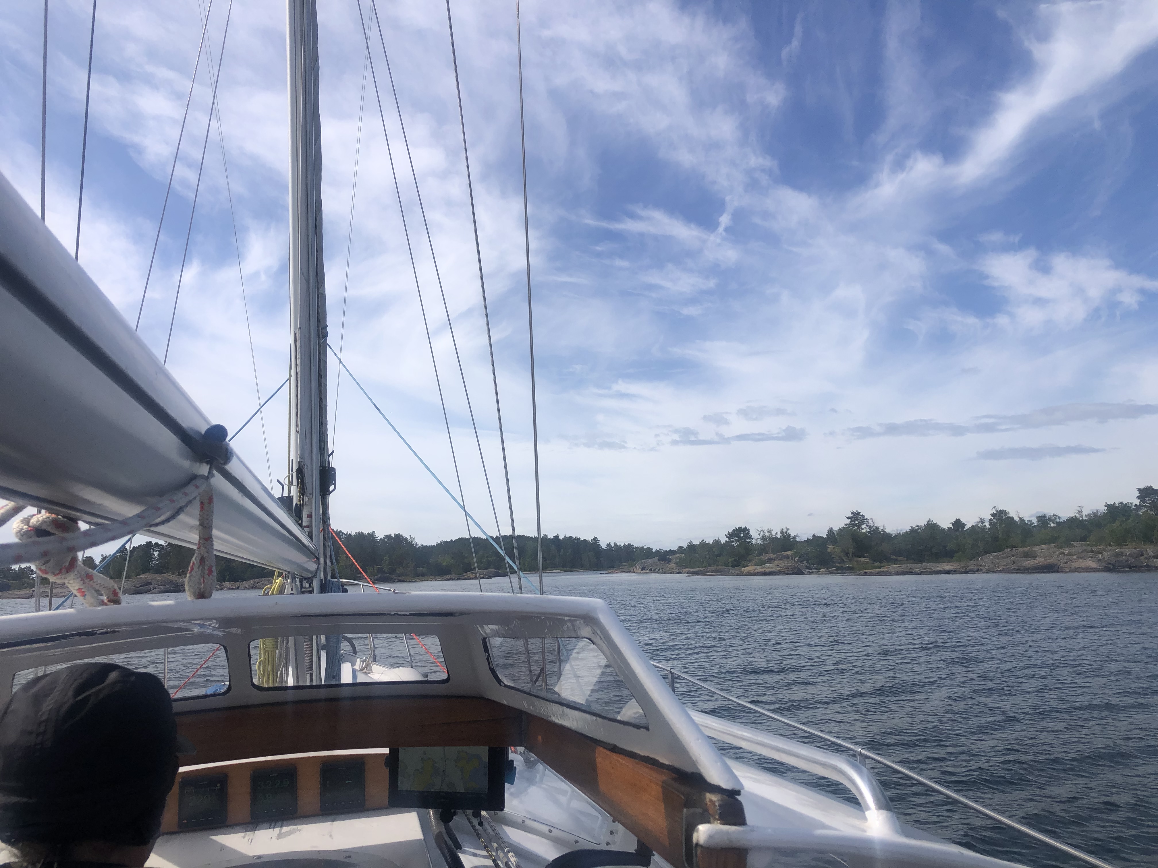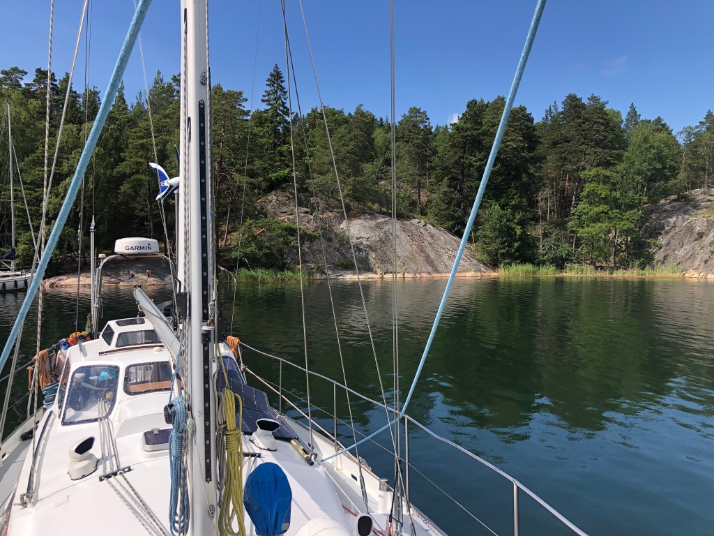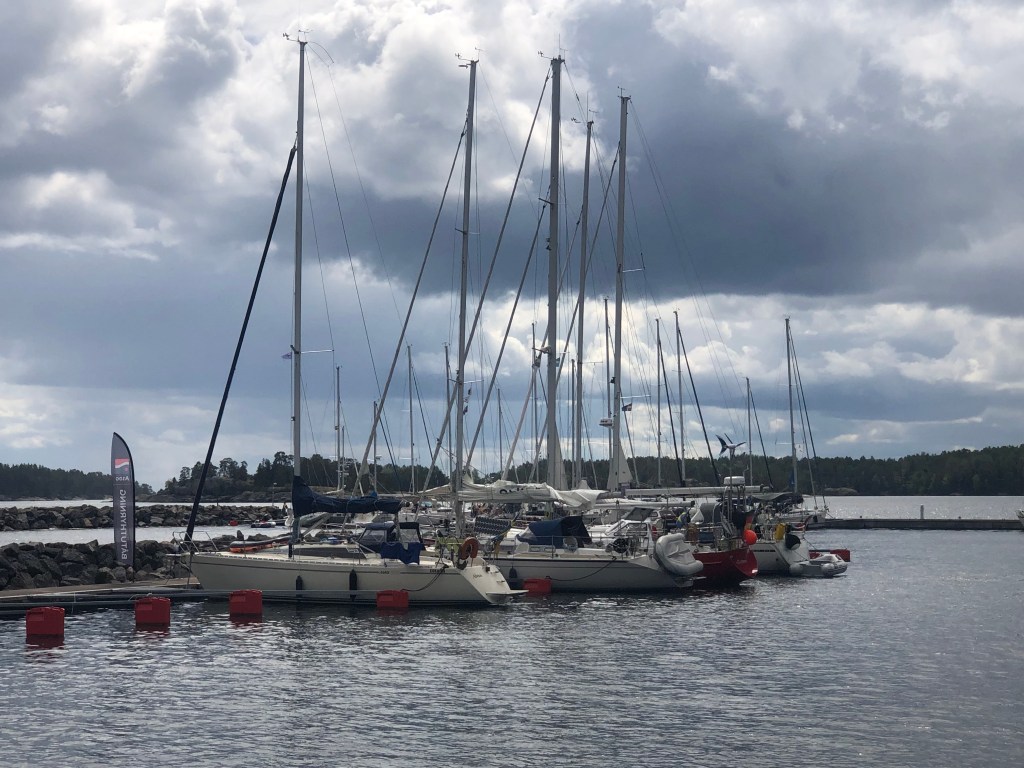 Unseren nächsten Zielhafen konnten wir nahezu umweltneutral erreichen. Der Wind kam anfangs in Stärke 3 aus westlicher Richtung, in Böen erreichte er bis zu 17 Knoten. Wir waren recht defensiv unterwegs und hatten die Segelfläche des Großsegels ins erste Reff verkleinert. Die letzten Meilen vorm Ziel drehte der Wind zunehmend auf Südwest und wir konnten die Höhe am Wind nicht mehr halten. Germane schafft bei optimalen Bedingungen einen Winkel von 50° am Wind, darunter segelt nichts mehr. Aufkreuzen im engen Schärenfahrwasser ist keine Option, daher muss der Diesel ran und uns die letzten Meilen in den Hafen schieben. Der kleine Hafen ist gemütlich und im Hafenführer wie folgt beschrieben: Der Hafen verfügt über alle Versorgungsmöglichkeiten und hat touristisch nichts zu bieten. Für uns genau das Richtige für den kommenden Tag im Boat-Office. Das Schöne am Reisen mit dem Boot sind auch immer wieder die spontanen Bekanntschaften mit anderen Crews. Wir hatten bereits einige tolle Begegnungen mit netten Menschen während unserer Reise. So ergibt sich heute auch wieder ein geselliger Abend mit schwedischen Nachbarliegern. Zum Unmut Anderer haben wir eine Menge Spaß bis spät in die Nacht.