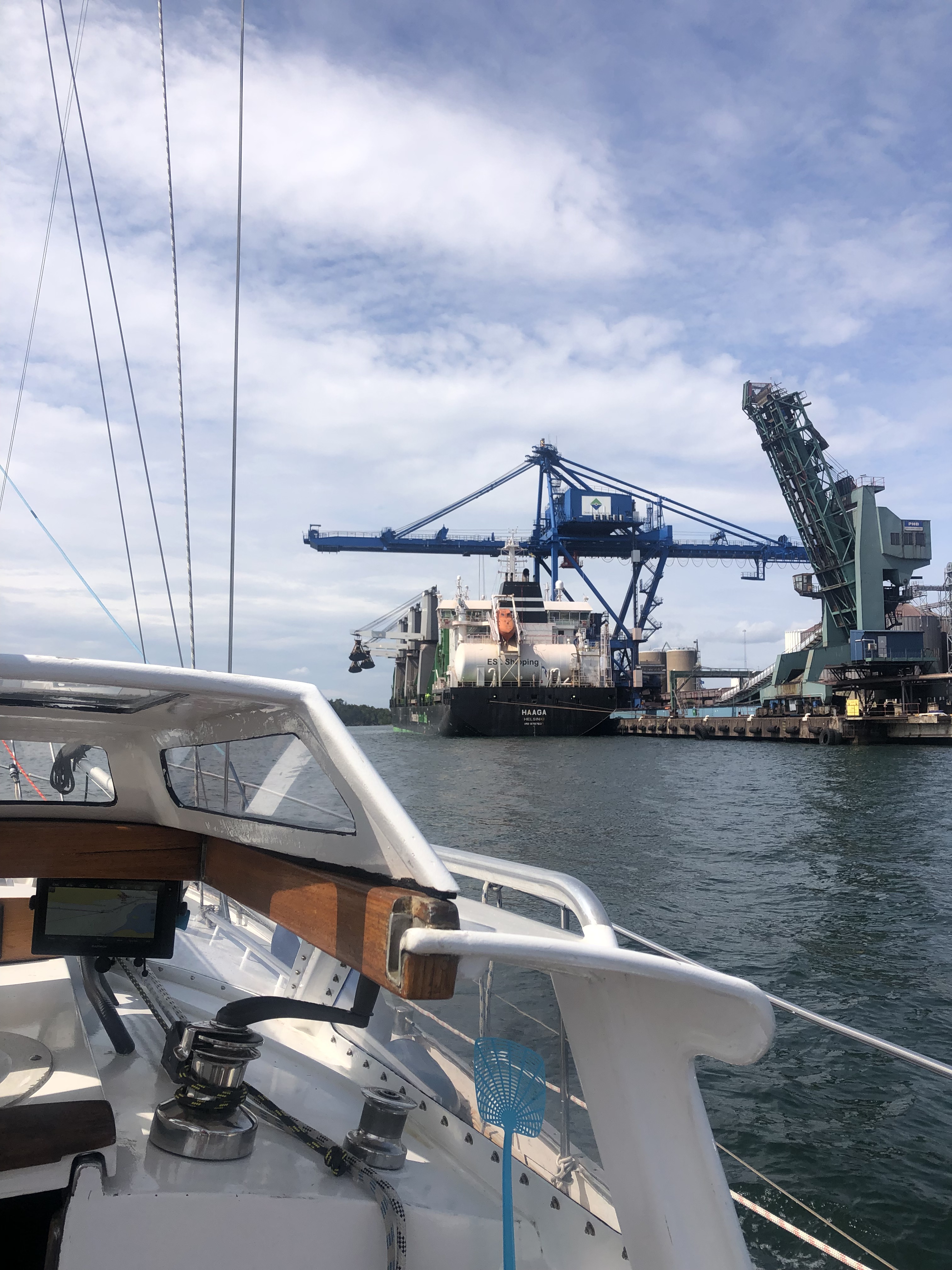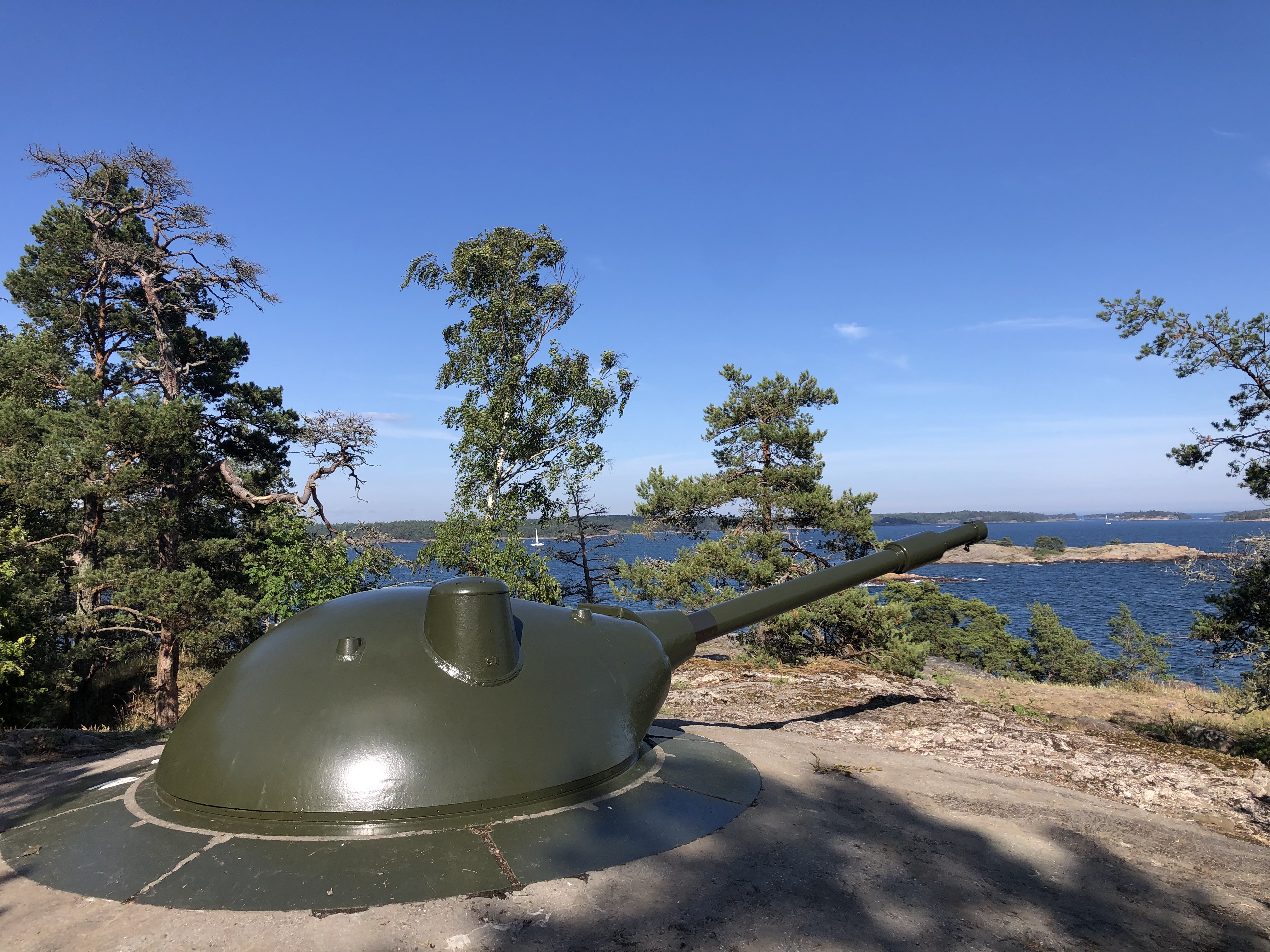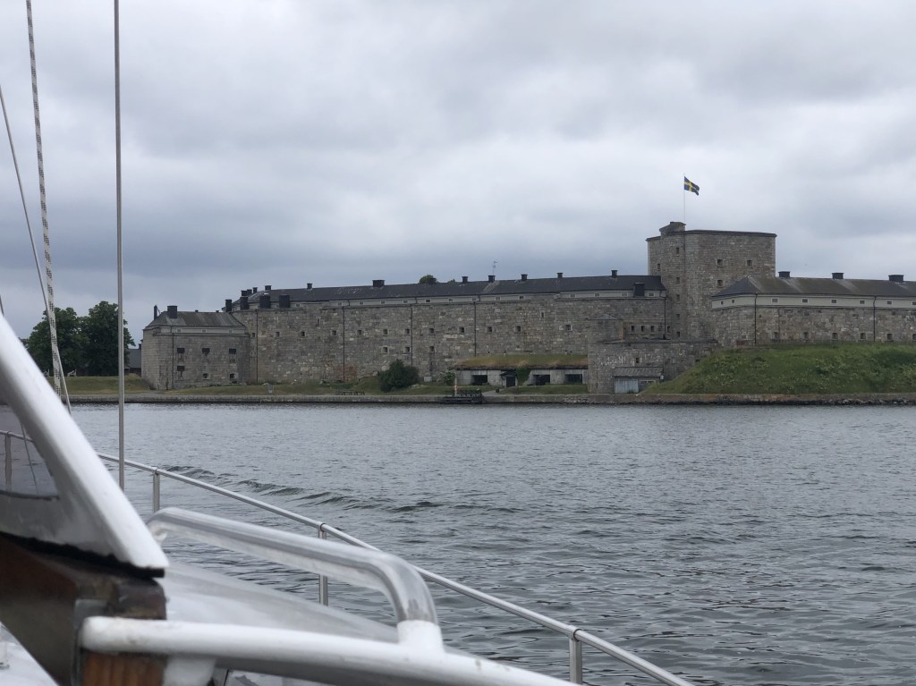 Für diese Etappe hatten wir nur ein kleines Wetterfenster zum Weiterkommen. Tagsüber war südlicher Wind der Stärke 3-4, in Böen bis 5 vorhergesagt. Gegen Abend sollte der Wind noch bis auf Stärke 8 zunehmen. Gute Bedingungen also, um tagsüber noch 35 Seemeilen gen Westen zu segeln. Der Zielhafen OXELÖSUND hatte uns auf dem Hinweg zwar abgeschreckt, jetzt liegt er aber günstig für unseren weiteren Weg nach Süden. Hinzu kommt, dass er uns von schwedischen Stegnachbarn in DALARÖ empfohlen wurde. Es gäbe dort eine alte Verteidigungsanlage aus Zeiten des kalten Krieges zu besichtigen und die Infrastruktur des Hafens sei gut. So viel vorab: Wir haben diese Schweden hier wieder getroffen sonst hätten wir davon ausgehen müssen, veräppelt worden zu sein. Unser Englisch ist jedenfalls gut genug, um hier „lost in translation“ als Ursache auszuschließen. Auf den letzten Meilen zeigte sich ein gruseliges Bild, als wir aus dem Schärenfahrwasser herauskamen und auf ein großes Stahlwerk zu segelten. Dieses musste passiert werden, um den Yachthafen am Ende eines Sunds anzulaufen. Im Hafen lagen bereits Yachten aus den Niederlanden, Schweden, England und Deutschland, die Schutz vor dem vorhergesagten Schlechtwetter der kommenden Nacht suchten. Zu allem Überfluss stellte sich bei unserer Ankunft heraus, dass der vorab gebuchte Liegeplatz für unsere Schiffsgröße äußerst ungünstig ist. Er ist zu dicht am Ufer und die Heckboje zum Festmachen ist zu nah am Heck. Mit Hilfe einer niederländischen Crew fummelten wir uns an den viel zu kleinen Liegeplatz, eine andere Möglichkeit bot sich ohnehin nicht. Die gesamte Hafenanlage besteht ausschließlich aus Schwimmstegen und bietet damit keinerlei Schutz vor den zu erwartenden Wellen. Diese Situation ließ böse Erinnerungen an letztes Jahr in Stavanger/ Norwegen wach werden. Dort lagen wir drei Tage an einem völlig ungeschützten Liegeplatz in der Falle. Hier galt es nun das Beste aus dieser Situation zu machen und wir belegten eine weitere Heckboje an der wir uns festmachten. Zusätzlich spannten noch weitere Festmacherleinen von Bug- und Mittelklampe zum Steg, um die Last besser zu verteilen. Ein weiser Entschluss, wie sich in der kommenden Nacht herausstellte. Als der Wind um drei Uhr seine maximale Stärke erreicht hatte, lag auch keine der anderen Crews mehr in ihren Kojen. Die Schwimmstege hoben und senkten sich mit den Wellen, die daran vertäuten Yachten zerrten windbedingt in seitliche Richtung. Es knarrte gewaltig am Steg wenn die Boote in die Festmacherleinen ruckten oder mit dem Bug gegen den Steg stießen. Wieder einmal waren wir froh, ein schweres und stabiles Schiff zu haben. Ungemütlich war es für uns zwar auch, aber wir mussten uns keine Sorgen machen, dass die Klampen aus dem Deck gerissen werden. Da wir eine Heckleine nicht stramm genug durchgesetzt hatten, hatte Germane dem Steg zwar eine ordentliche Kopfnuss verpasst aber außer einer Macke im Lack keinen Schaden davon getragen. Andere Crews sind nachts ausgelaufen, um weitere Schäden zu vermeiden. Am Vormittag nahm der Wind ab und es kam wieder etwas Ruhe in die verbleibenden Boote. Wir nutzen den freien Tag vor dem anstehenden Boat Office für eine Wanderung zu der ehemaligen Verteidigungsanlage. Diese erstreckt über eine kleine Halbinsel und ist heutzutage als Museum frei zugänglich. Aus Gesprächen mit Einheimischen erfahren wir, dass sie sich durch Russland unmittelbar bedroht fühlen. Man sehe es mittlerweile als Fehler an, diese Anlagen aufgegeben zu haben.