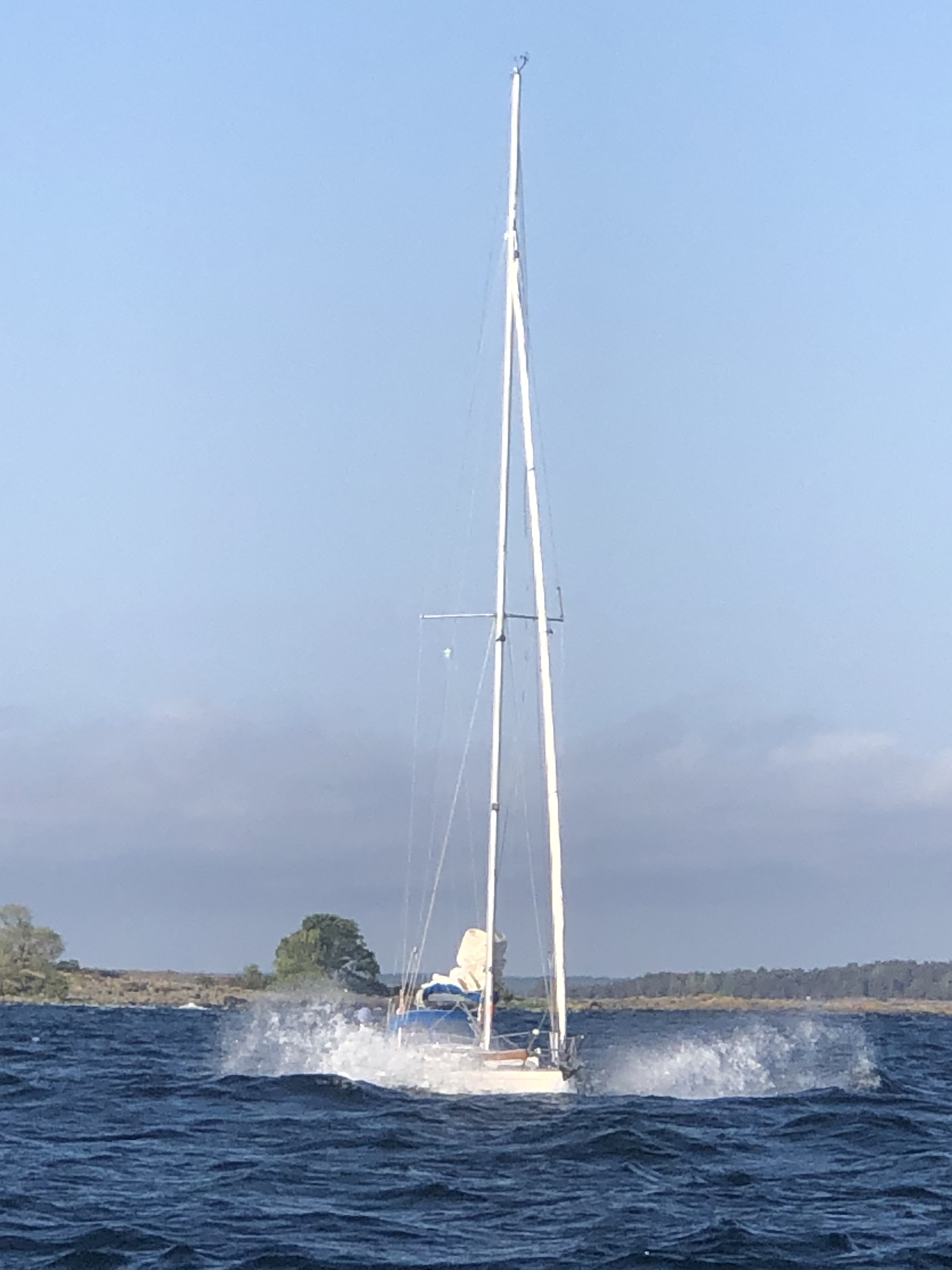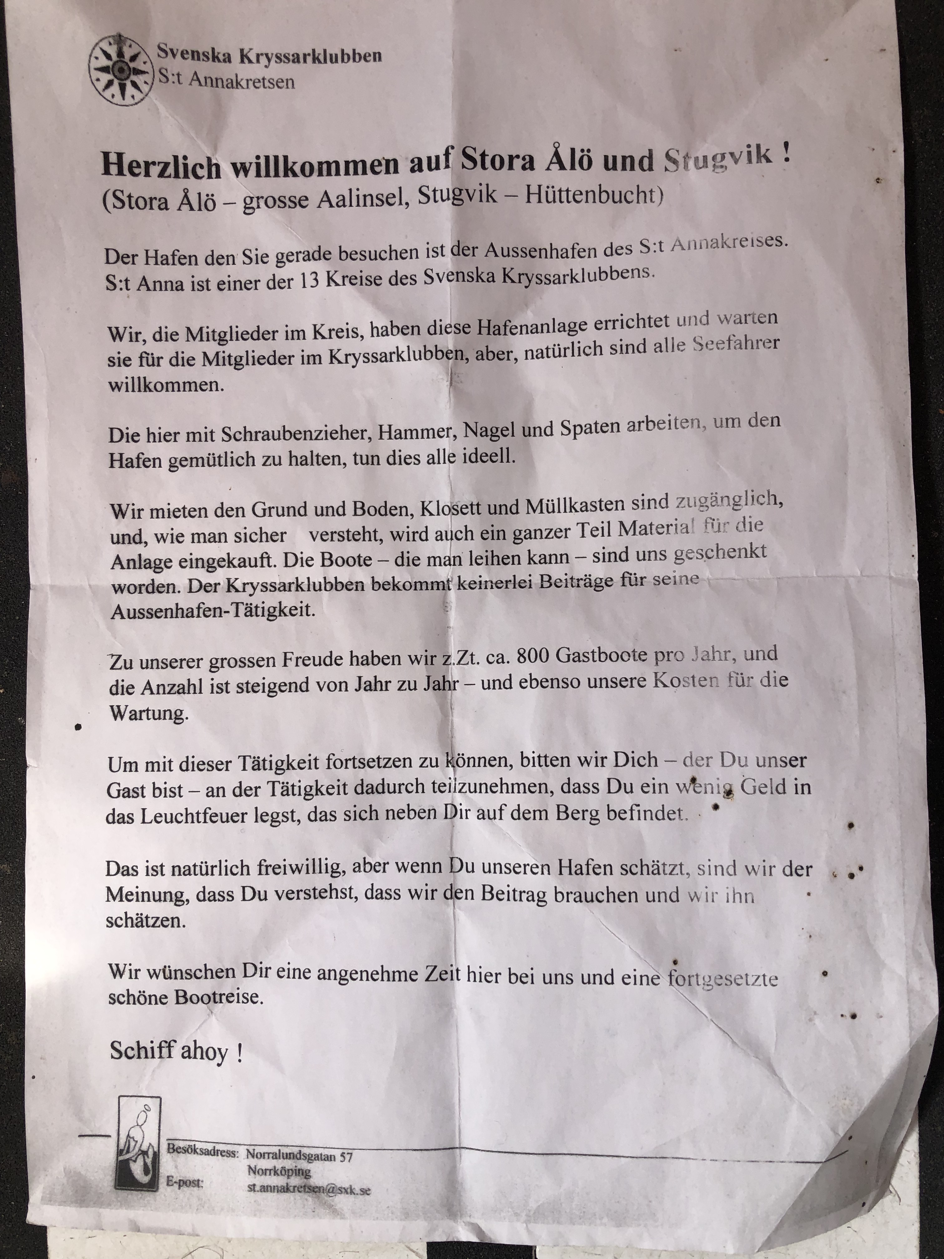 Radengel – Rumpel – Klöter, machte es als wir im engen Fahrwasser zwischen zwei Schären Grundberührung hatten. Wir fuhren mit etwa 5 Knoten entlang der vorgegebenen Route und hätten nach Seekarte noch 40cm Wasser unterm Schwert haben müssen. Glücklicherweise ist Germane „geländegängig“ und solide aus Stahl gebaut. Ein weiterer Vorteil ist der variable Tiefgang dank Schwert-Hydraulik. Diese erlaubt uns das Schwert hochzupumpen und den Tiefgang von 2,2 auf 1,4m zu verringern. Stößt das Schwert gegen ein Hindernis, wie hier geschehen, öffnet ein Überdruckventil und das Schwert klappt nach oben. Kein schönes Geräusch, aber gut zu wissen, dass wir keine strukturellen Schäden davon gezogen haben können. Bei einer GFK Yacht mit festem Ballast Kiel wäre dies anders ausgegangen. Der Schreck war dennoch groß und wir pumpen das Schwert komplett hoch, da wir die letzten Meilen ohnehin nicht segeln können. Belohnt werden wir ein paar Seemeilen weiter mit einer schönen Bucht, die wir uns zuvor aus der Seekarte ausgesucht hatten. Sie entspricht der Beschreibung aus dem Hafenführer und es gibt sogar noch freie Anlegeplätze am Vereinssteg. Viele Schweden sind über Vereine organisiert, die kleine Naturhäfen betreiben. Die Liegeplätze sind für die Mitglieder reserviert, bei freien Kapazitäten sind Gastlieger gegen Zahlung einer kleinen Spende willkommen. Angelegt wird mit Heckanker und Bug zum Steg. Hört sich einfach an, ist es sicherlich auch wenn der Heckanker hält. Bei unserm Manöver findet der Heckanker keinen Halt und wir treiben, bedingt durch Seitenwind, quer zum Steg. Na Prima, die Wassertiefe nimmt zum Steg hin deutlich ab, hinzu kommt noch die Ankerleine die wir im Bereich des Propellers hinter uns her ziehen. Mit viel Ruhe und gespielter Gelassenheit ziehen wir zunächst den Heckanker an Bord, um uns danach wieder Rückwärts in tieferes Wasser zu manövrieren. Für das nächste Anlegermanöver nutzen wir eine der dafür vorgesehenen Heckbojen und sind kurz danach, mit dem Bug voraus, am Steg fest. Diese Naturhäfen sind mit viel Mühe und handwerklichen Geschick in die Schären gebaut. Bedenkt man, dass sämtliches Material auf dem Wasser transportiert werden musste, freut man sich um so mehr hier festmachen zu dürfen. Wir verbringen den Rest des Tages mit Inselerkundung, Schwimmen und Karten spielen. Morgen soll es weiter gehen.