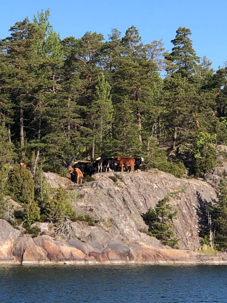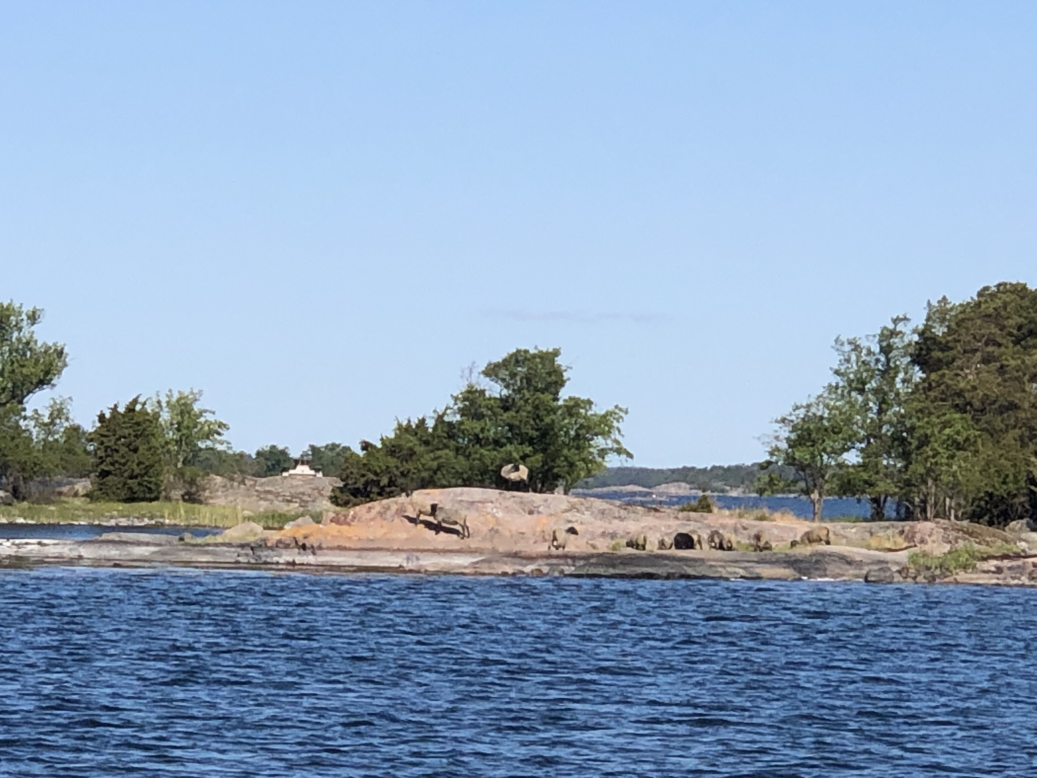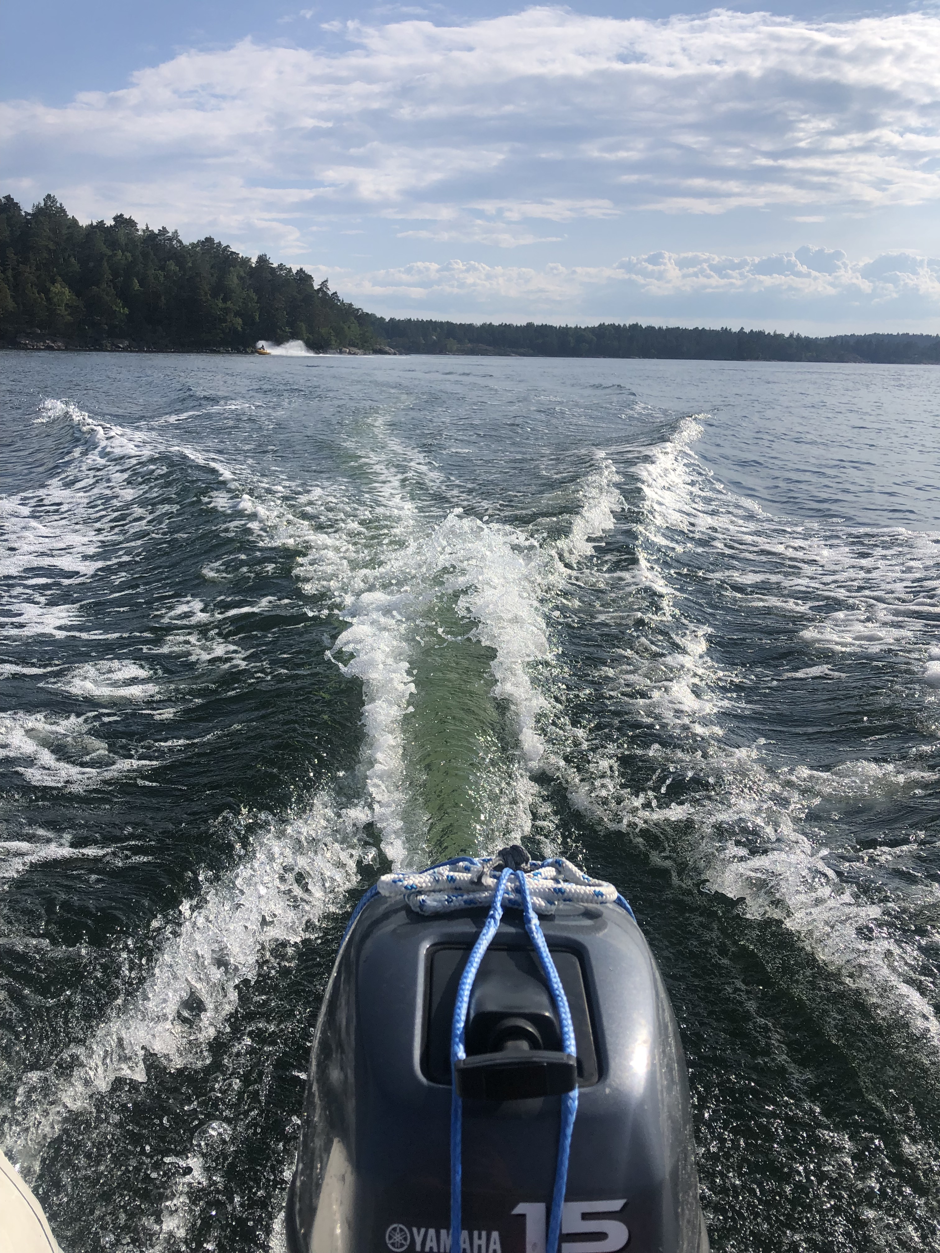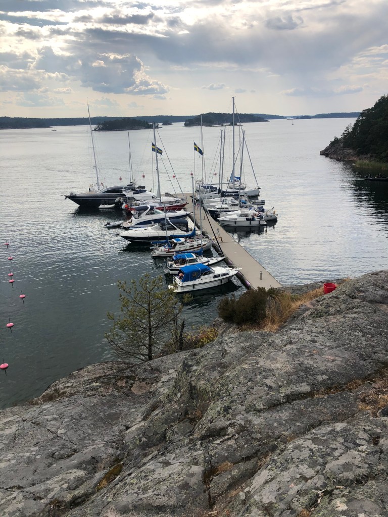Irgendwie schaffen wir es bei unserer Routenplanung immer wieder die absoluten „Hot-Spots“ anhand der Seekarte zu finden. Dieser Hafen, den wir für das freitägliche Boat Office ausgesucht hatten, ist innerhalb kürzester Zeit ausgebucht. Mittlerweile sind wir in der Hochsaison und die Schweden machen Sommerurlaub. Verständlicherweise verbringen diesen viele in den Schären. Die Insel GRINDA ist ein beliebtes Urlaubsziel mit kleinem Fähranleger, kleinem Yachthafen, Zeltplatz, Restaurants und einem Hotel. Dennoch geht es hier gemütlich zu und ist nicht zu vergleichen mit dem Trubel in Stockholm. Hier bietet es sich an, mal wieder unser Dinghy ins Wasser zu lassen. An Ankerplätzen inmitten der Natur haben wir doch ein schlechtes Gewissen, um nur zum Spaß durch die friedlichen Buchten zu heizen und dabei deren Idylle zu zerstören. Hier fällt das nicht auf, da von hier aus auch Touren mit Speedbooten in die Schären starten. Es macht wirklich Spaß (Dirk mehr als Simone) mit unserem übermotorisierten Dinghy durch die Bucht zu düsen. Das 2,6m lange Festrumpf-Schlauchboot kommt, angeschoben mit von einem 15PS Außenborder, schnell ins Gleiten und macht ordentlich Geschwindigkeit. Es komplett auszufahren hat sich bislang noch keiner von uns getraut. Hier werden wir ein paar Tage verbringen, um dann noch vor dem vorhergesagten Schlechtwetter der nächsten Woche nach VAXHOLMEN zu segeln.