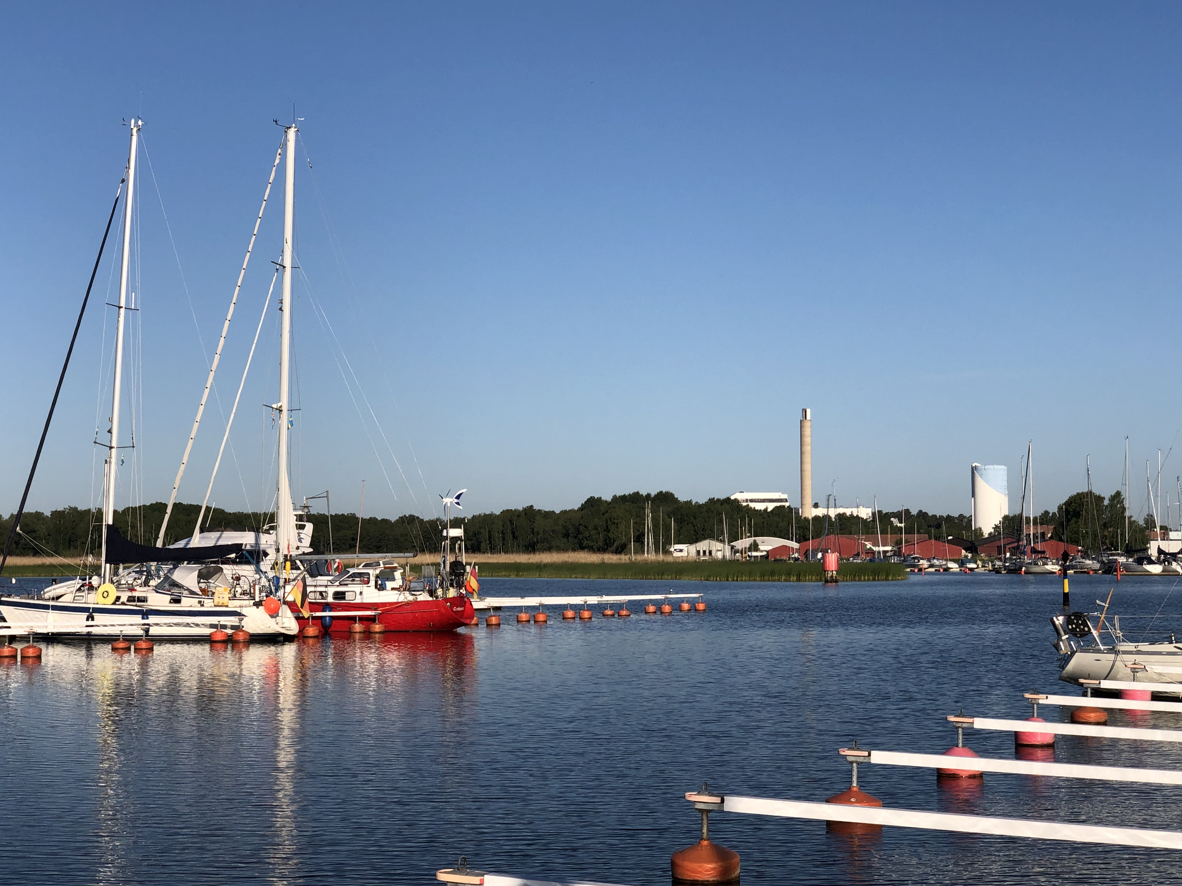 Es geht uns auf der Reise nicht nur um ein weiters Etappenziel sondern auch um die Strecke dorthin. Von unserem, anhand der Seekarte ausgesuchten Ziel OXELÖSUND, wurde uns abgeraten. Wir sollen besser 10 Seemeilen weiter bis nach NYKÖBING segeln. Das er mit diesem Rat Recht behalten sollte zeigte sich spätestens als wir aus dem Schärengürtel herauskamen und auf eine Industriestadt zufuhren. Als krassen Gegensatz zur friedlichen Natur sah man hier schon von weitem die Anlagen eines Stahlwerks. In regelmäßigen Abständen wurden große weiße Rauchwolken frei, die das ohnehin schon abschreckende Bild abrundeten. Diesen Ort wären wir auch ohne den Rat nicht angelaufen. Wir sind froh als die Industrieanlagen außer Sicht sind und wir wieder durch schöne Schärenlandschaft dem Ziel entgegen segeldieseln. Bei nur 10 Knoten Wind unterstützt der Diesel wobei wir 6,5 Knoten Fahrt machen. Erst im engen Fahrwasser zum Hafen nehmen wir das Vorsegel weg und laufen in den großen und wenig besuchten Gästehafen ein. Neben uns liegen hier nur noch vier weitere Yachten. In unmittelbarer Nähe befindet sich eine Hafenpromenade mit Kneipen, Restaurants und einer Eisdiele. Liegegebühren fallen nicht an, sagt uns der Hafenmeister am Telefon. „Feel free to use all our facilites and connect to shore power“ Das hört man doch gerne. In den vorherigen Häfen hatten wir durchschnittlich 24,-€ Liegegeld pro Nacht bezahlt. Strom, Waschmaschine und Duschen kamen extra. Hier gibt es sogar die Sauna für „umme“. Die kleine Stadt macht bei der ersten Erkundung einen guten Eindruck auf uns. Hier sind wir für die nächsten zwei Office-Tage gut aufgehoben, um dann in kleinen Schlägen weiter nach STOCKHOLM zu segeln.