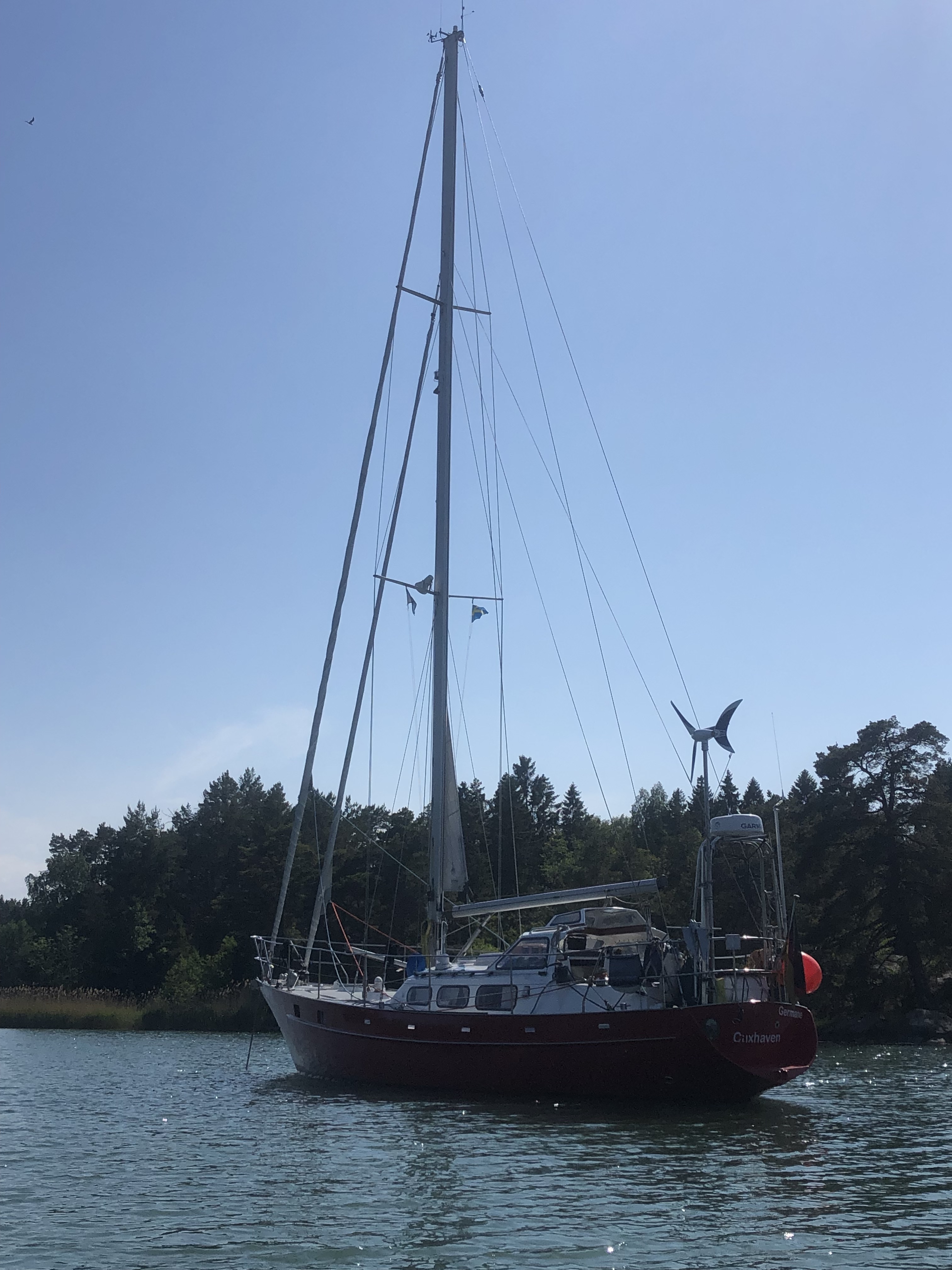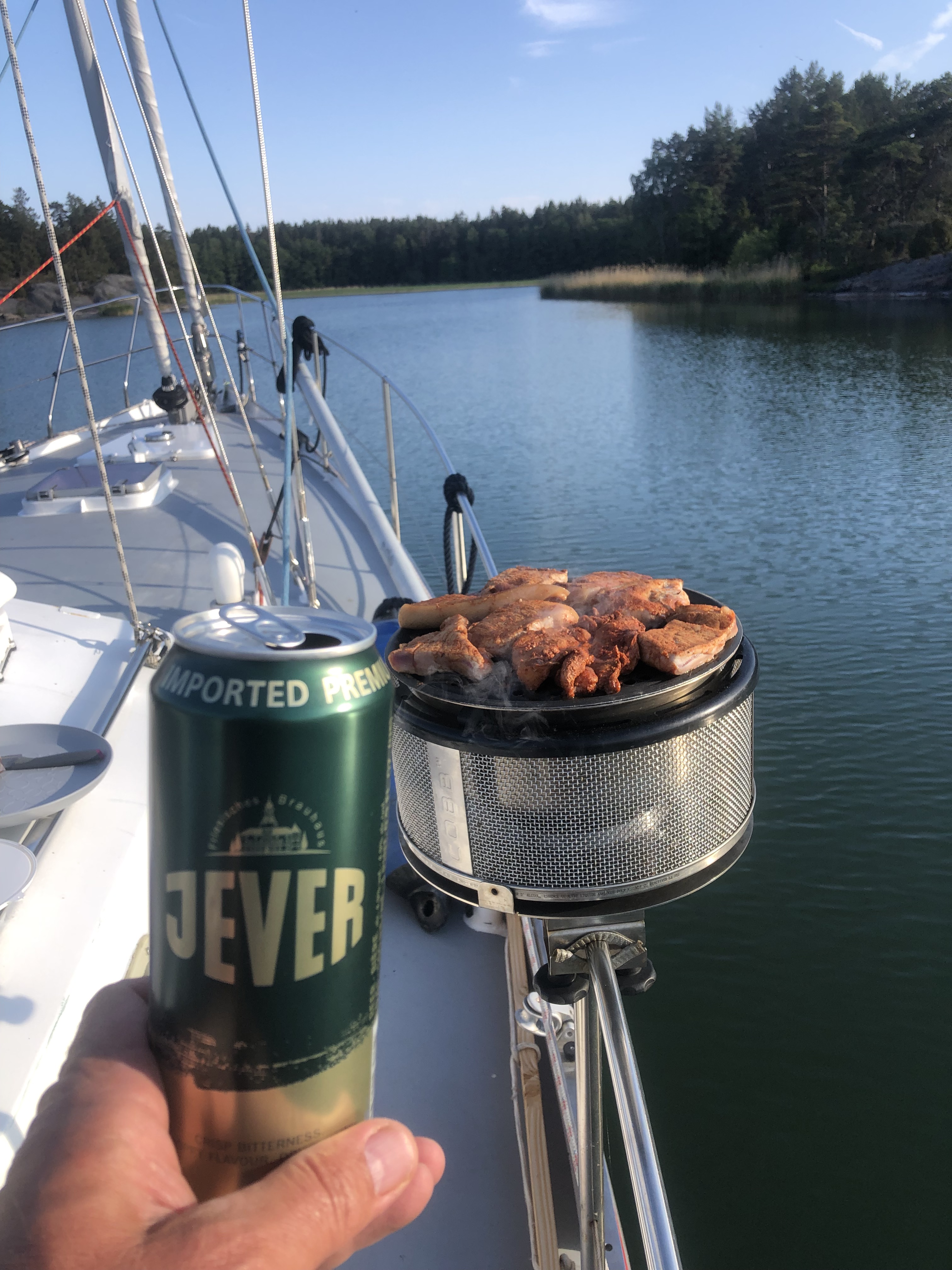 Ein dicker Fang. Bei der Kontrolle unserer Seewasserfilter staunten wir nicht schlecht. Es wurde ein kleiner Fisch in den Kühlkreislauf unseres Motors gesaugt. Gut, dass wir ein doppeltes System haben und es dadurch zu keiner Unterbrechung der Motorkühlung kam. Immerhin haben wir jetzt unseren ersten Fisch gedieselt. Nach Reinigung der Filter ging es bei wenig Wind weiter und wir konnten gemütlich unserem nächsten Ziel entgegensegeln. Bei 8Knoten Wind macht Germane auf „Am Wind Kurs“ 4,5 Knoten Fahrt durchs Wasser. Diesmal passt sogar unser Timing und der Wind dreht passend zur Kursänderung nach Nordosten mit. Auf den letzten Seemeilen frischt der Wind noch etwas auf, Germane legt sich auf die Seite und nimmt Fahrt auf. So hätte es gerne noch ein paar Meilen weiter gehen können aber als das Fahrwasser zum Hafen in Sicht kommt müssen wir die Segel streichen, um an unseren Liegeplatz zu motoren. Der Hafen macht einen guten Eindruck, alle Versorgungsmöglichkeiten sind in unmittelbarer Nähe. Die Hafenpromenade besteht aus mehreren Restaurants, kleinen Läden, Fischbuden und Kneipen. Bei unserer ersten Stadterkundung verhageln wir auch direkt in angenehmer Atmosphäre bei Livemusik. Für die nächsten zwei Office Tage ist der Hafen optimal. Alle Versorgungsmöglichkeiten sind in unmittelbarer Nähe und es gibt sogar eine Sauna, deren Benutzung im Hafengeld von 28,-€ beinhaltet ist. Am Mittwoch soll es über eine Ankerbucht in den Schären weiter Richtung Stockholm gehen. Wir müssen unbedingt ins nächste Hard Rock Cafe, um die ranzige Hamburger Skipper Mütze zu ersetzen (meint Simone).
