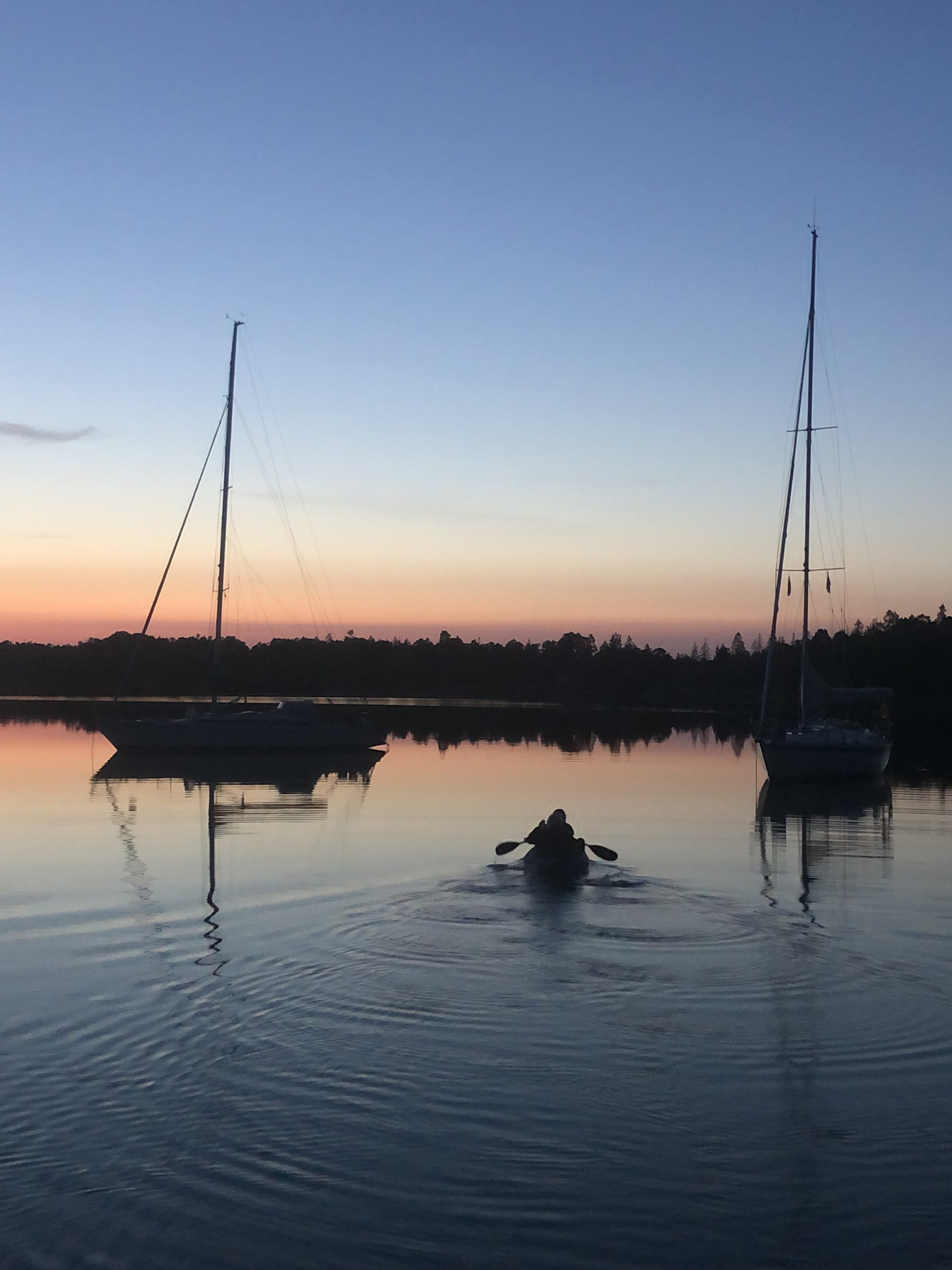 „Hallo Germane, wir sollen euch von Guido und Ilona grüßen“. So werden wir von zwei Paddlern begrüßt, als wir an einer Mooring-Boje festmachen. Wir kommen schnell mit Eva und Christian ins Gespräch und es stellt sich heraus, dass die Beiden letztes Jahr mit unseren Bekannten ein Stück gemeinsam gesegelt sind. Sie haben von Ilona erfahren, dass wir auch hier unterwegs sind. Als sie unseren roten Rumpf sahen sind sie kurzerhand zu uns rüber gepaddelt. Schöne kleine Welt der Fahrtensegler. Man kommt schnell ins Gespräch, tauscht Informationen aus und gibt sich wichtige Tipps. So erfahren wir, dass zwei Seemeilen weiter eine viel schönere Bucht ist. Wir überlegen nicht lange, werfen die Leine wieder los und verabreden uns an einem gemeinsamen Ankerplatz. Schon beim Einlaufen sind wir begeistert. Hinter der schmalen Einfahrt öffnet sich eine gut geschützte Bucht, die sich in weitere kleinere Buchten verzweigt. Ein herrliches Fleckchen Natur inmitten der Schärenlandschaft. Unser Anker fällt auf drei Meter Wassertiefe und hält sofort. Er hält sogar so gut, dass Dirk fast über die Reling geht als Simone in gewohnter Weise rückwärts einkuppelt, um den Anker einzufahren. Wir machen unser Dinghy klar und fahren rüber zur SY CHILLY von Eva und Christian. Als wir mit einem Kaffee in der Hand gemütlich beim Klönschnack sitzen läuft eine Yacht unter Segeln in die Bucht ein. Einhandsegler Ulli, mit dem wir bereits in NYKÖPING nette Stunden verbracht haben, zögert nicht lange und fährt unter Segeln ein perfektes Ankermanöver. Wir verabreden einen Grillabend bei uns an Bord und haben einen tollen Abend. Wir lieben diese Art zu reisen. Man verabredet sich und jeder bringt etwas mit. Dadurch kommt eine abwechslungsreiche Mahlzeit zustande ohne das es zulasten der Vorräte Einzelner geht. Am nächsten Morgen schwimmen wir noch eine Runde ums Boot, holen unser Dinghy an Deck und gehen Anker auf. Wir winken uns zum Abschied zu, hoffentlich sehen wir uns irgendwo nochmal.