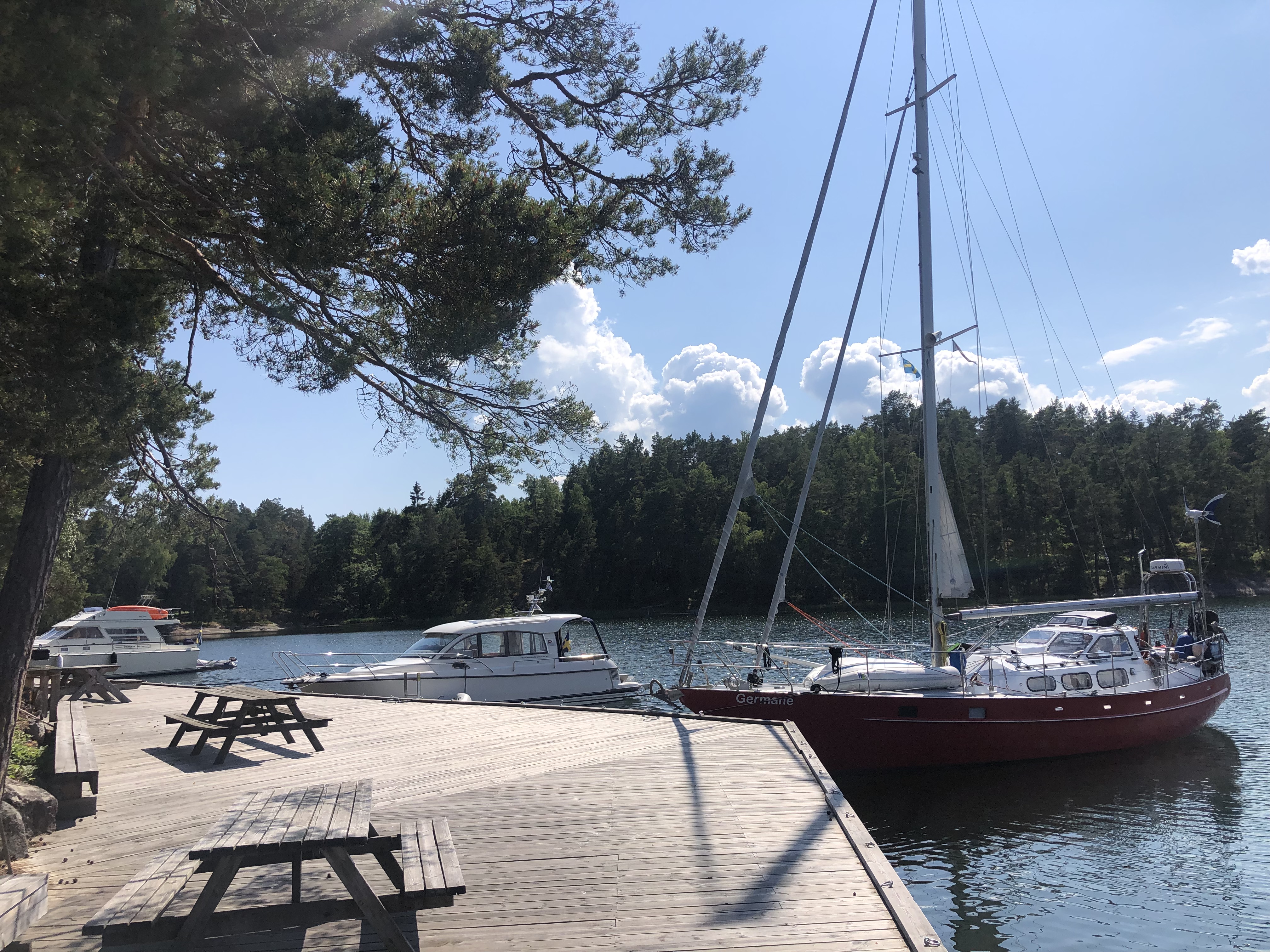 Unseren ersten „Schärenliegeplatz“ haben wir eher zufällig gefunden. Für unsere weitere Reise hatten wir uns vorgenommen nur noch kürzere Etappen zu segeln. Die Etappenziele suchen wir entsprechend der Entfernung aus der Seekarte heraus. Zu den Office Tagen wollen wir in Häfen liegen, in den Tagen dazwischen ankern. Die Ankerplätze müssen zudem ausreichend geschützt gegen das zu erwartende Wetter sein. Diese Bucht war zur Windseite offen, da aber kein Starkwind vorhergesagt war sind wir sie dennoch angelaufen. Die Seekarte zeigte uns einige Flachwasserbereiche mit 1,5m Wassertiefe an, zum Ufer hin flacher werdend. Das schlimmste Scenario wäre für uns auf Grund zu laufen und mit eigener Kraft nicht wieder frei zu kommen. Von der Nordsee sind wir es gewohnt mit den Gezeiten zu planen, um Wassertiefen zu berechnen. Wenn wir uns dort nicht gerade bei Hochwasser und Springtide festfahren, steigt das Wasser auch wieder, um frei zu kommen. Hier käme in diesem Falle nur der Bergetrupp gegen Bezahlung. In unserem Schraubenwasser sehen wir bereits aufgewühlten Schlamm, somit haben wir kaum noch Wasser unter dem Kiel (Tiefgang Germane 1,4m bei eingeklapptem Schwert). In der Bucht liegen noch zwei weitere kleinere Segelyachten an einem Holzsteg. Einer der Skipper erkennt anhand der zögerlichen Kreise, mit denen wir uns in die Bucht hineintasten, unsere Bedenken. Er steht auf dem noch freien Holzsteg und ruft uns zu, dass die Wassertiefe am Steg 1,5m beträgt. Wenn die für uns ausreichend ist dürfen wir gerne längsseits festmachen. In diesem Fall entfällt das umständliche Gefummel zuerst eine Leinenverbindung mit dem Heck zu einer Boje herzustellen, um danach mit dem Bug an den Steg zu kommen. Wir hätten auch innerhalb der Bucht an einer der Mooring-Bojen festmachen können, hätten dann aber mit unserem Dinghi an Land fahren müssen. Längsseits am Steg festzumachen ist dagegen die Komfortlösung. Wir nehmen allen Mut zusammen, vertrauen auf die Aussage des fremden Skippers und fahren zum Steg. Unser Echolot zeigt 0,0m an, also kein Wasser mehr unterm Kiel. Jetzt hoffen wir, das der Boden aus weichem Schlick besteht und nicht aus Fels. Wir machen längsseits fest und können den Boden sehen. Dies liegt zum Einen am klaren Ostseewasser, zum Anderen aber an der geringen Wassertiefe. Trotzdem schwimmen wir noch frei, ein kleiner Fels hatte dies geändert. Belohnt werden wir mit einem herrlichen Liegeplatz inmitten schöner Natur.